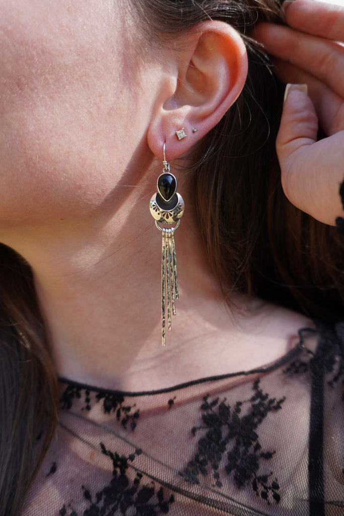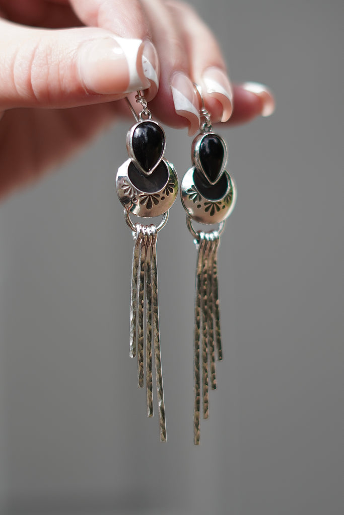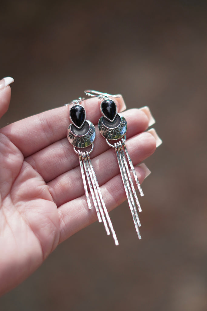 Deep black Onyx stones paired with a hand stamped crescent moon and long hammered silver fringe. These earring are lighter weight and have a fun movement to them.