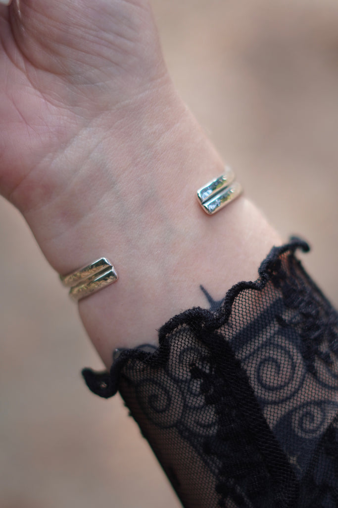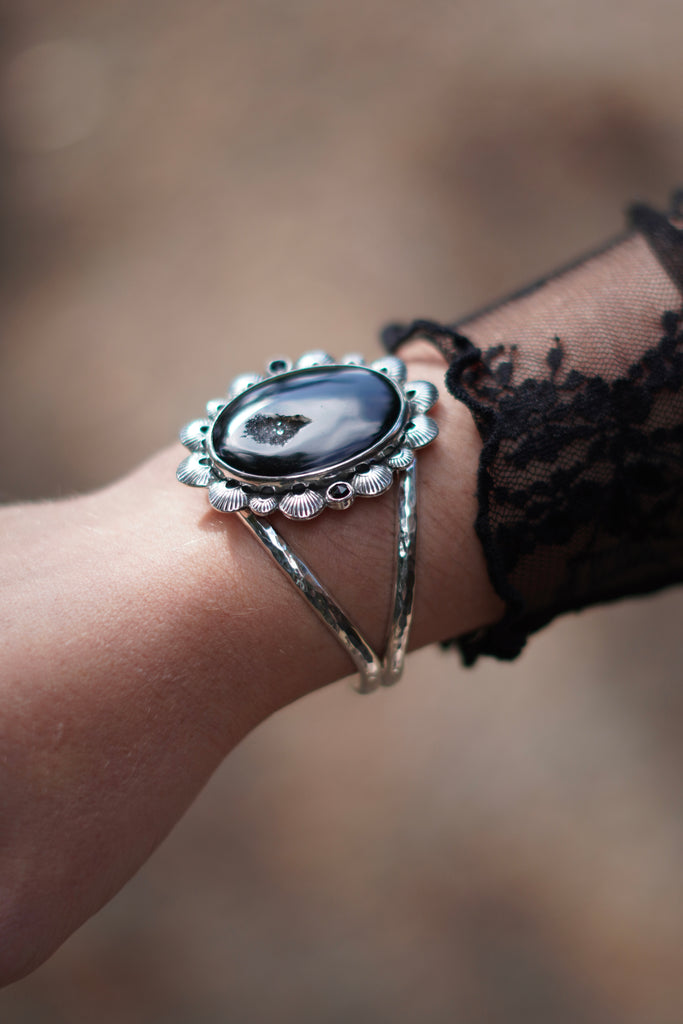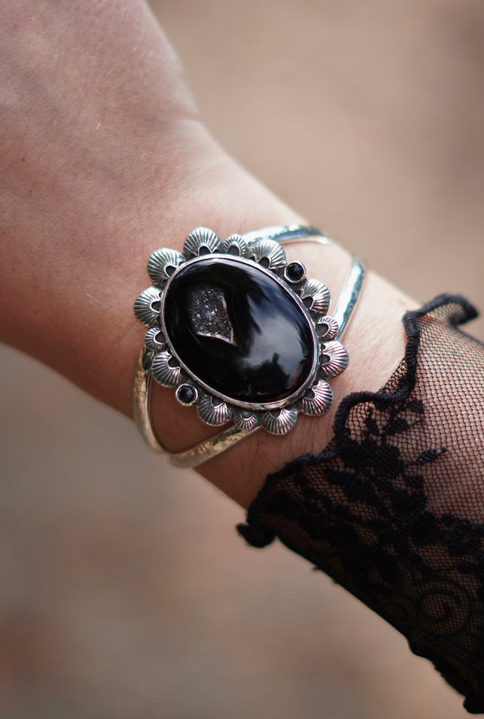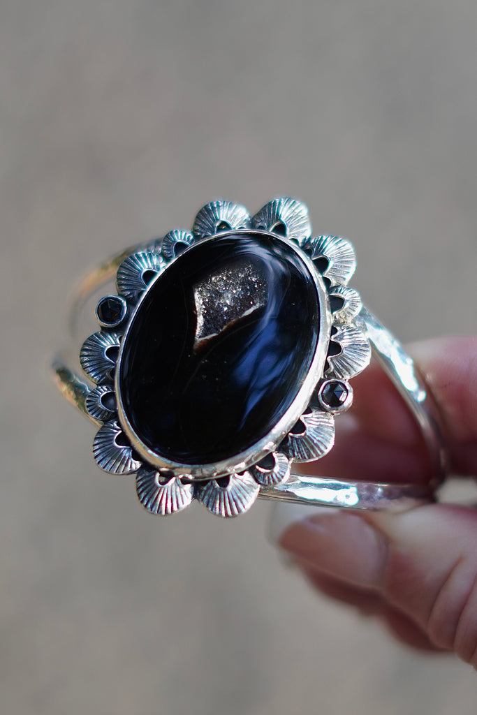 A stunning Onyx stone with a sparkly druzy crystal pocket is paired with hand stamped details and two small Black Spinel accent stones. The double band cuff features a hammered texture and measures about 6.5 inches including the 1 inch gap in the back.