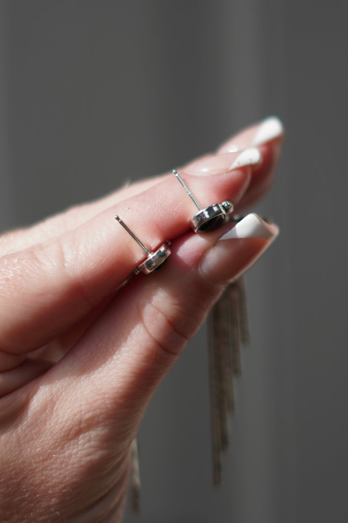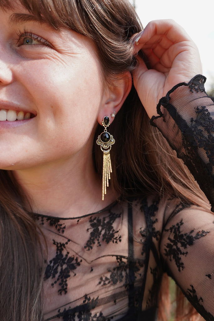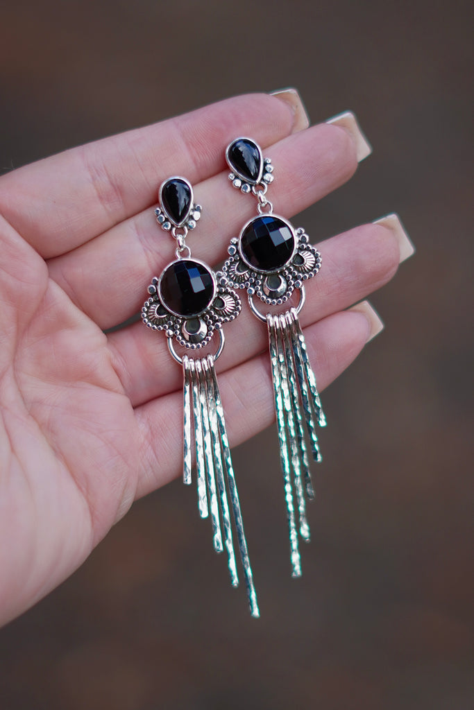 Onyx stones adorned with hand stamped details and long hammered silver fringe. These are a stud style earring.