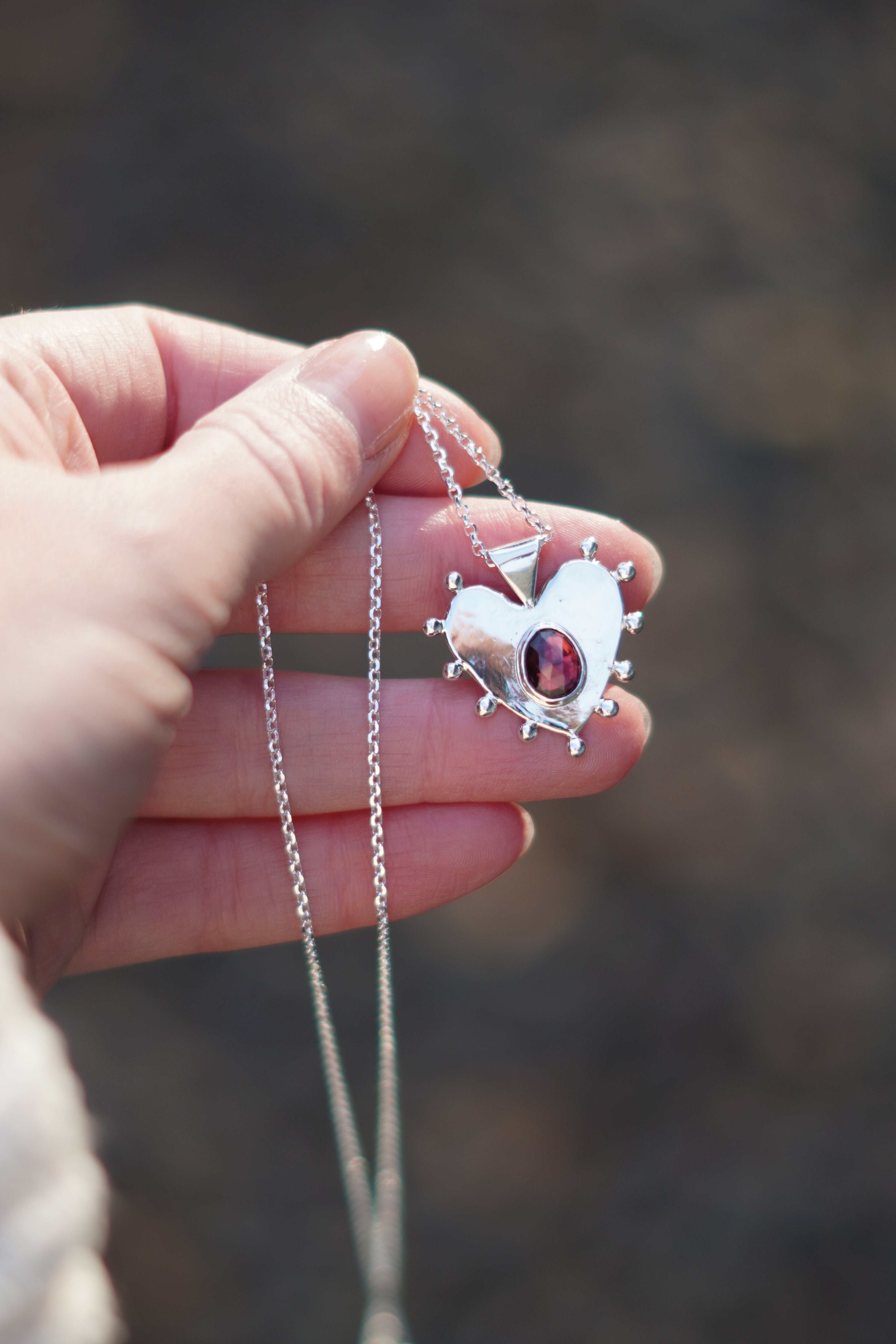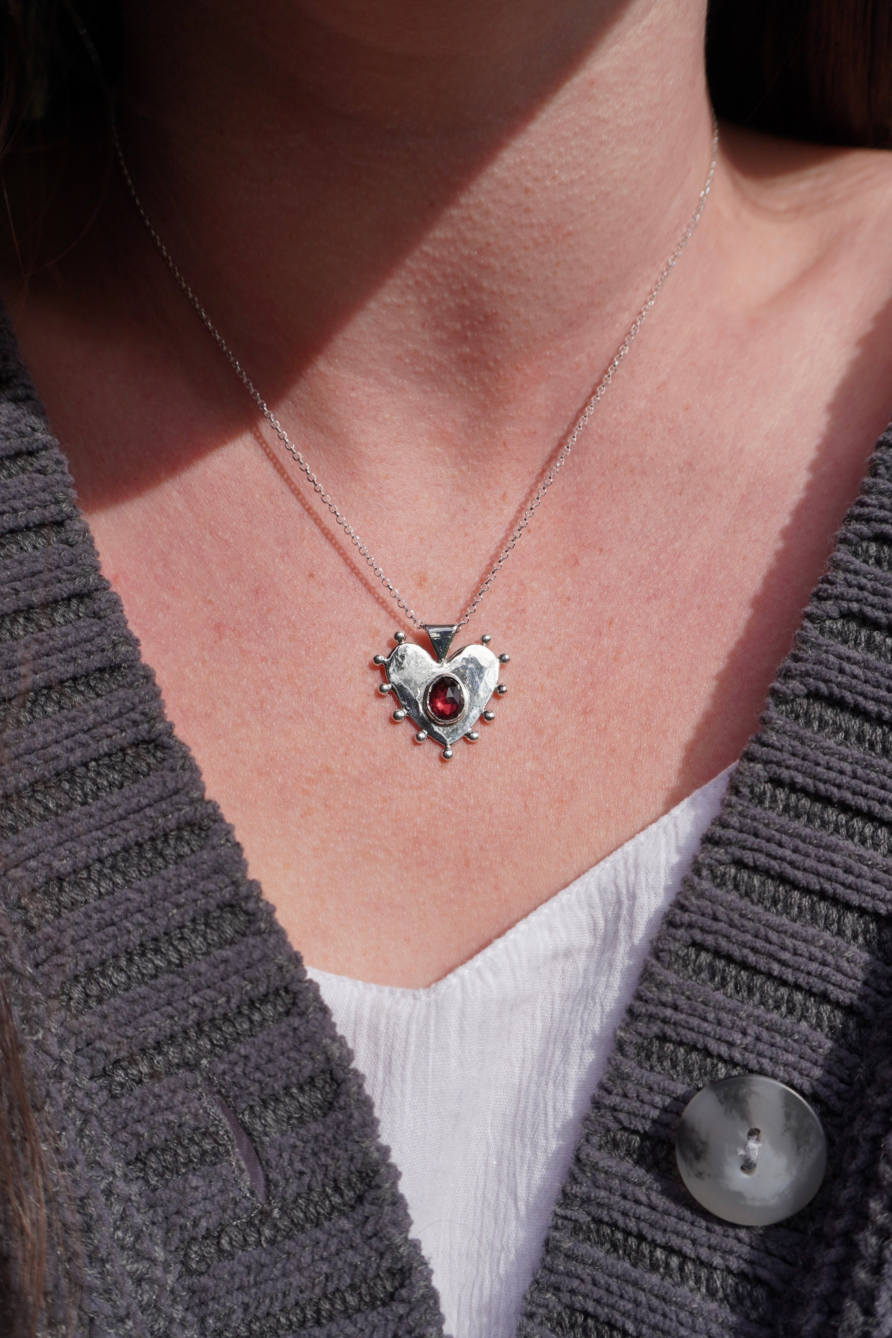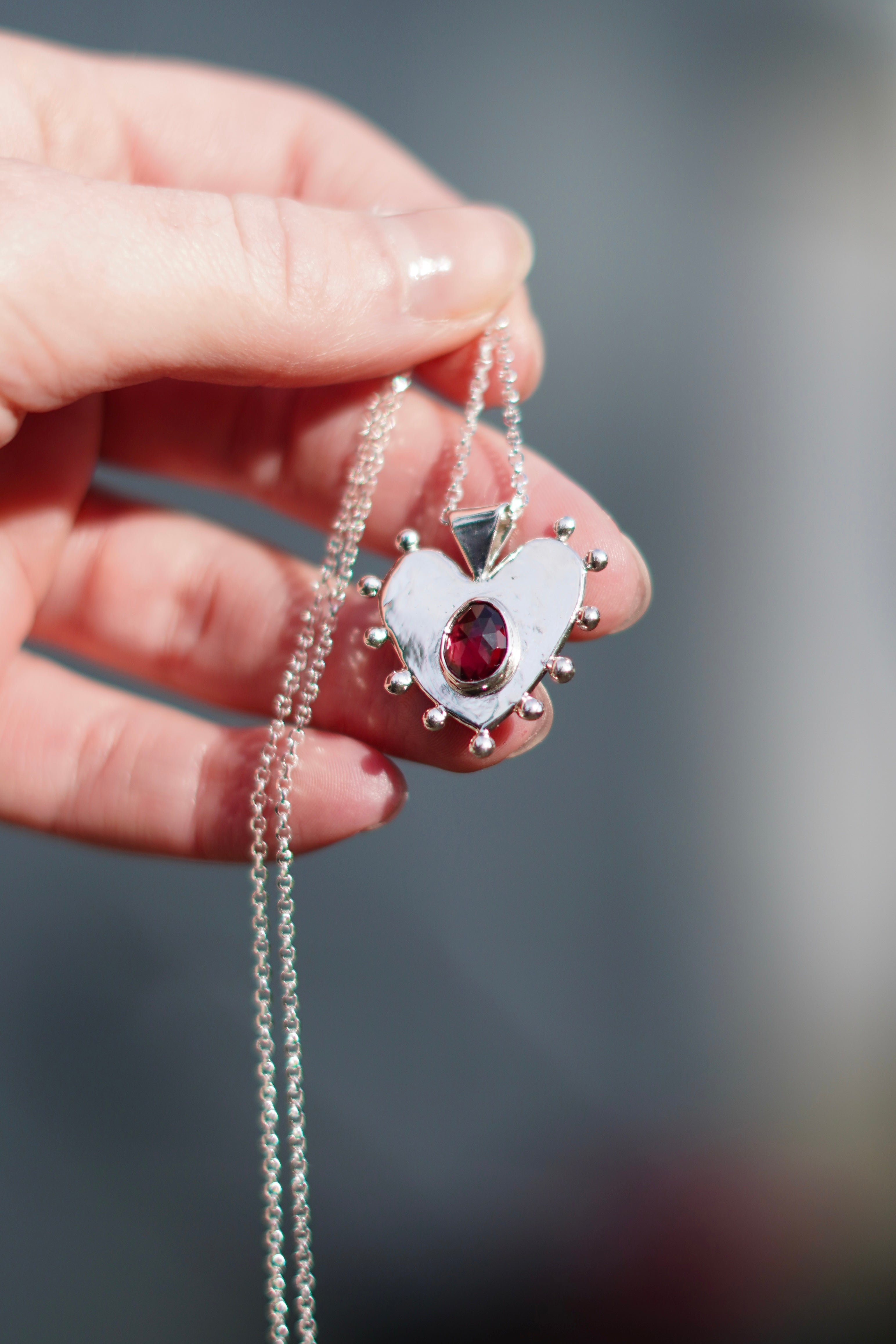 Reclaimed sterling silver heart pendant featuring a stunning faceted Rhodolite Garnet stone on an 18 inch Rolo chain.