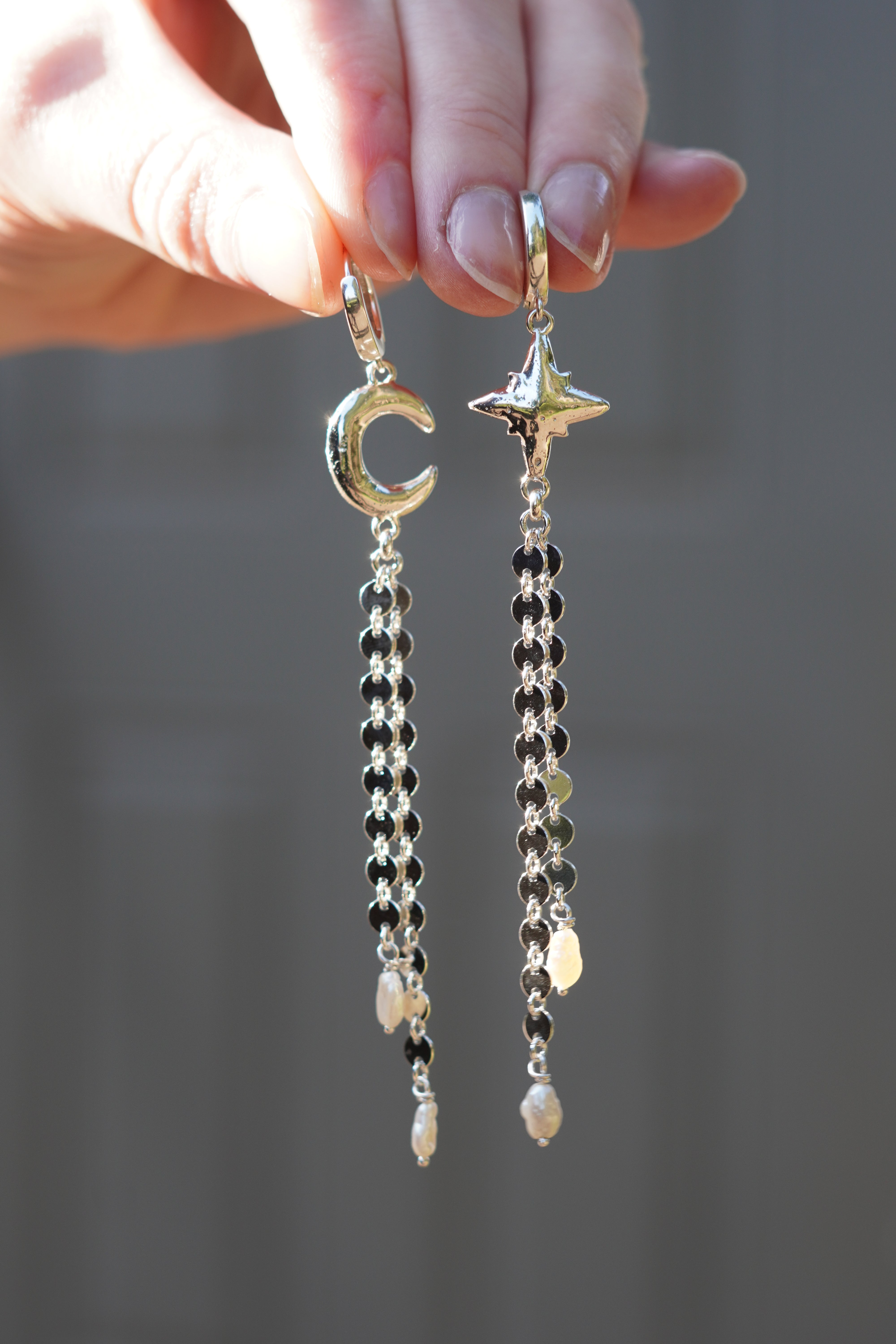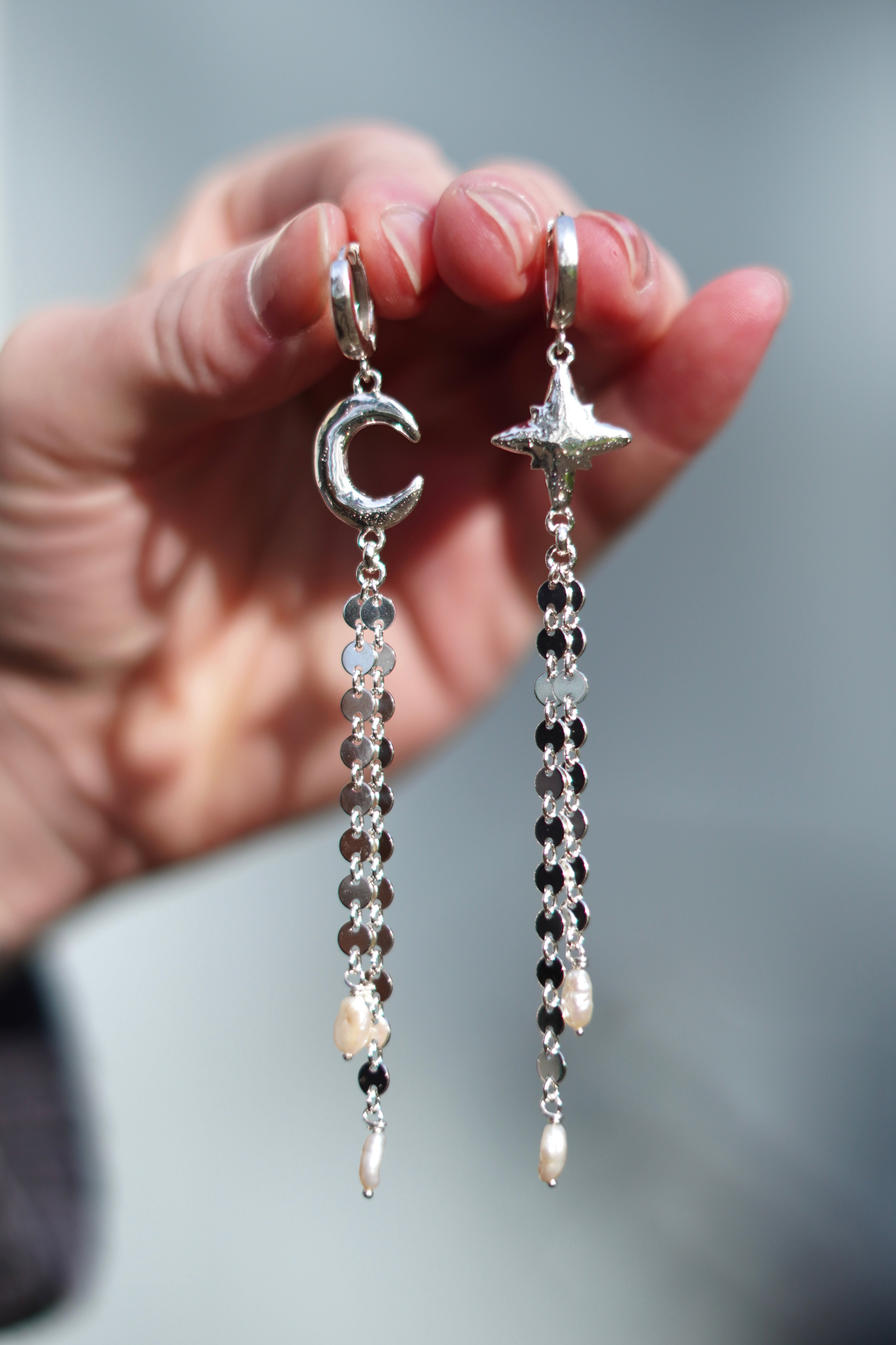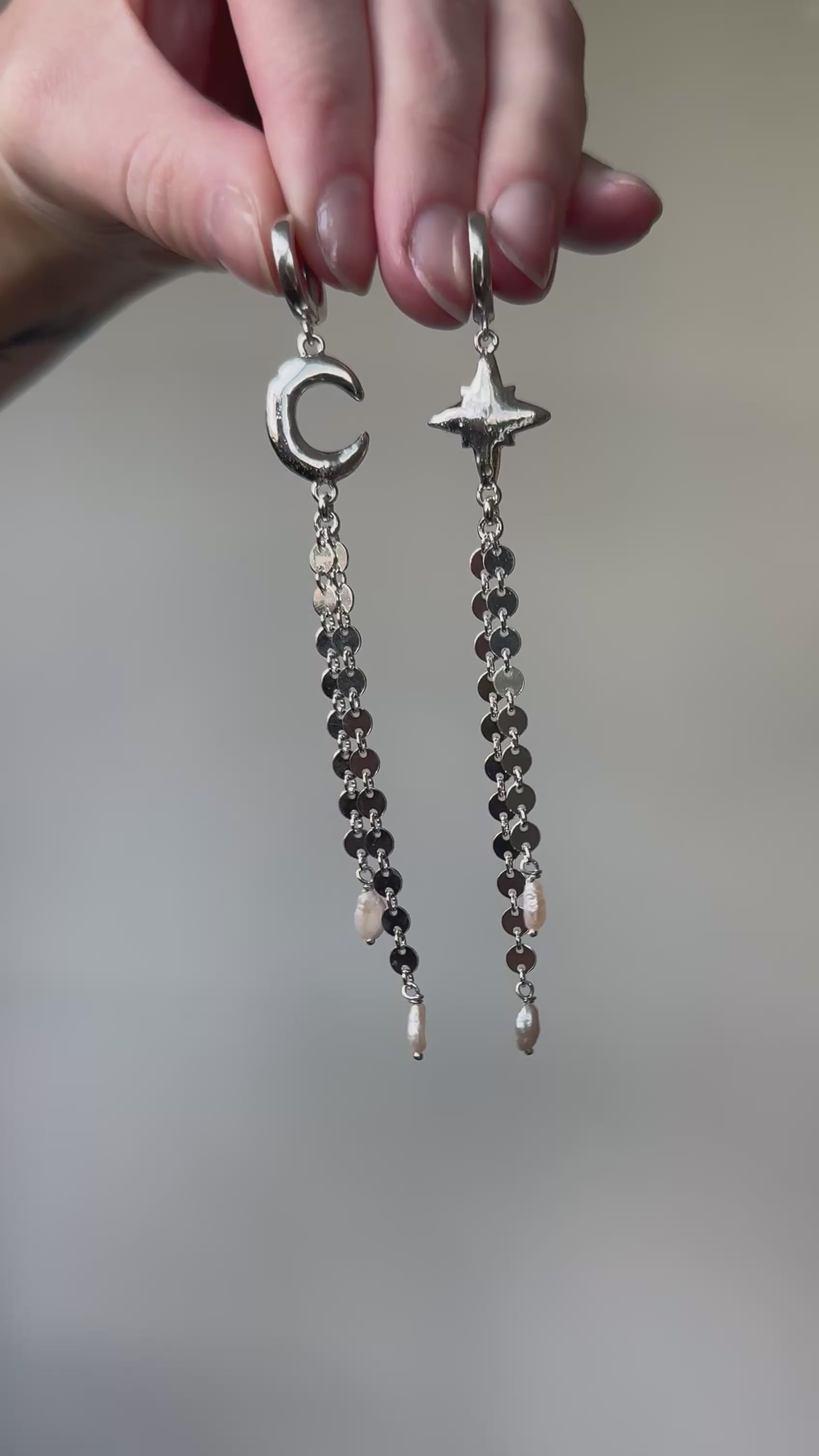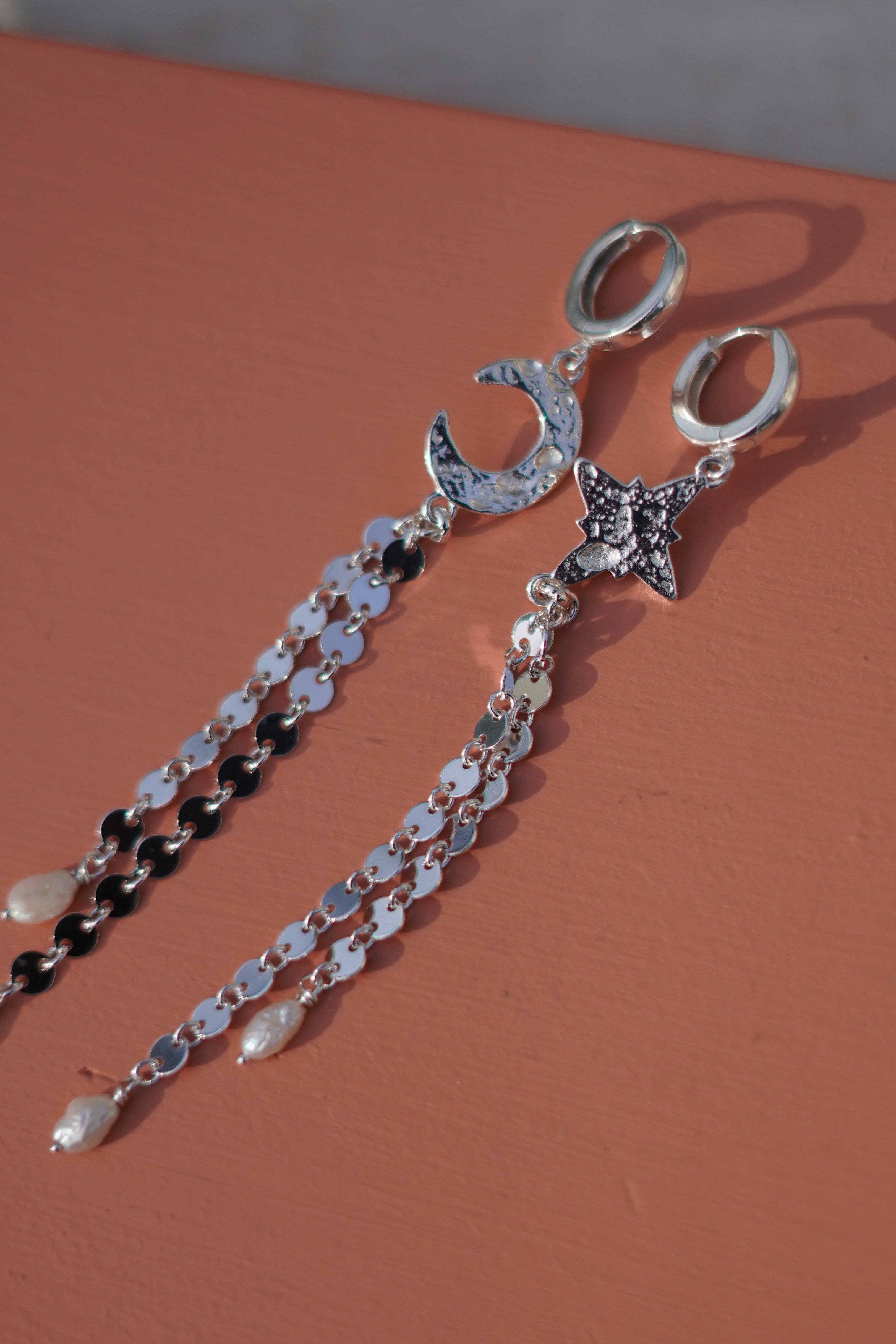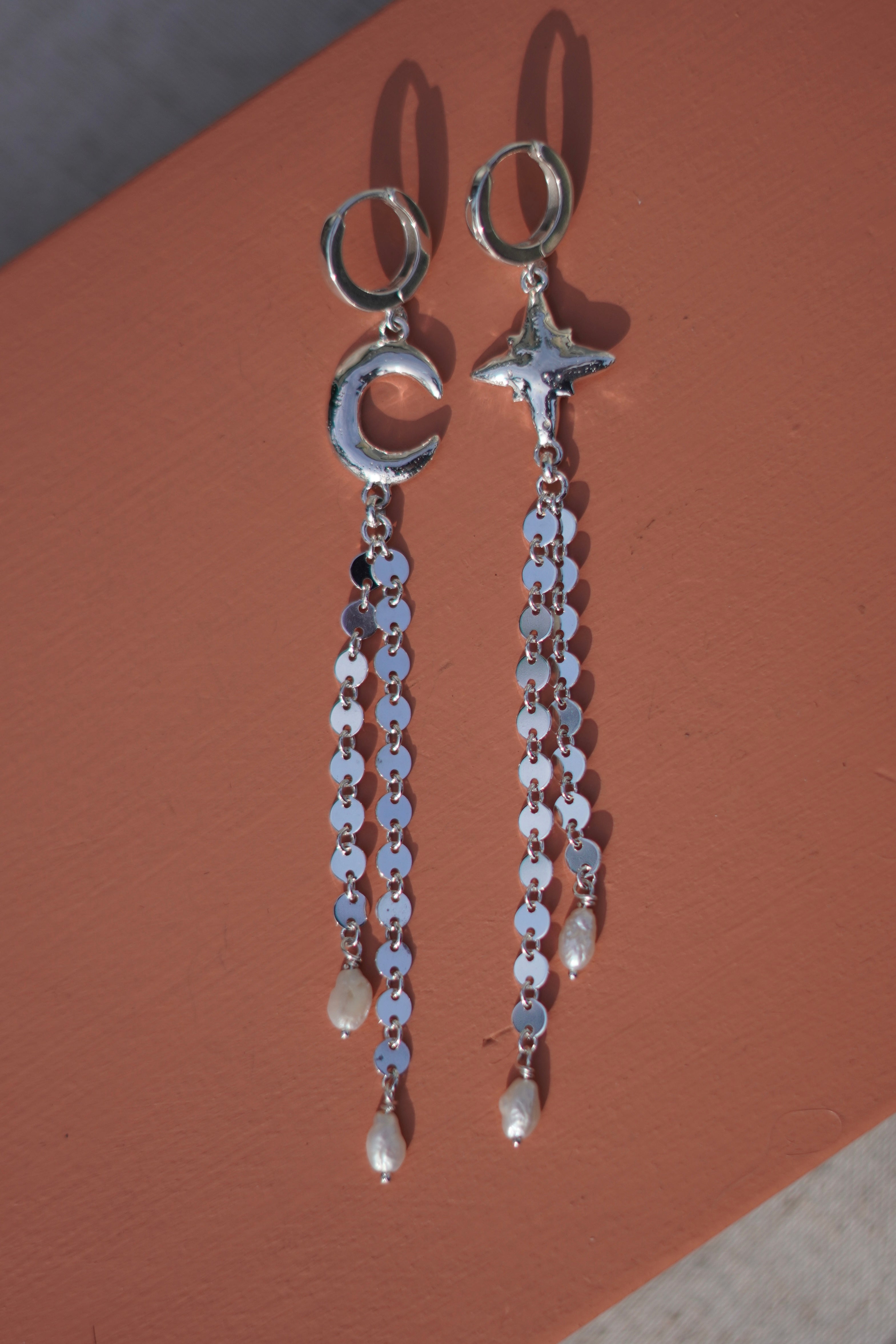 Reclaimed sterling silver moon and star charms with sparkly coin chain fringe and cute pearls accents. These earrings feature a huggie hoop closure.