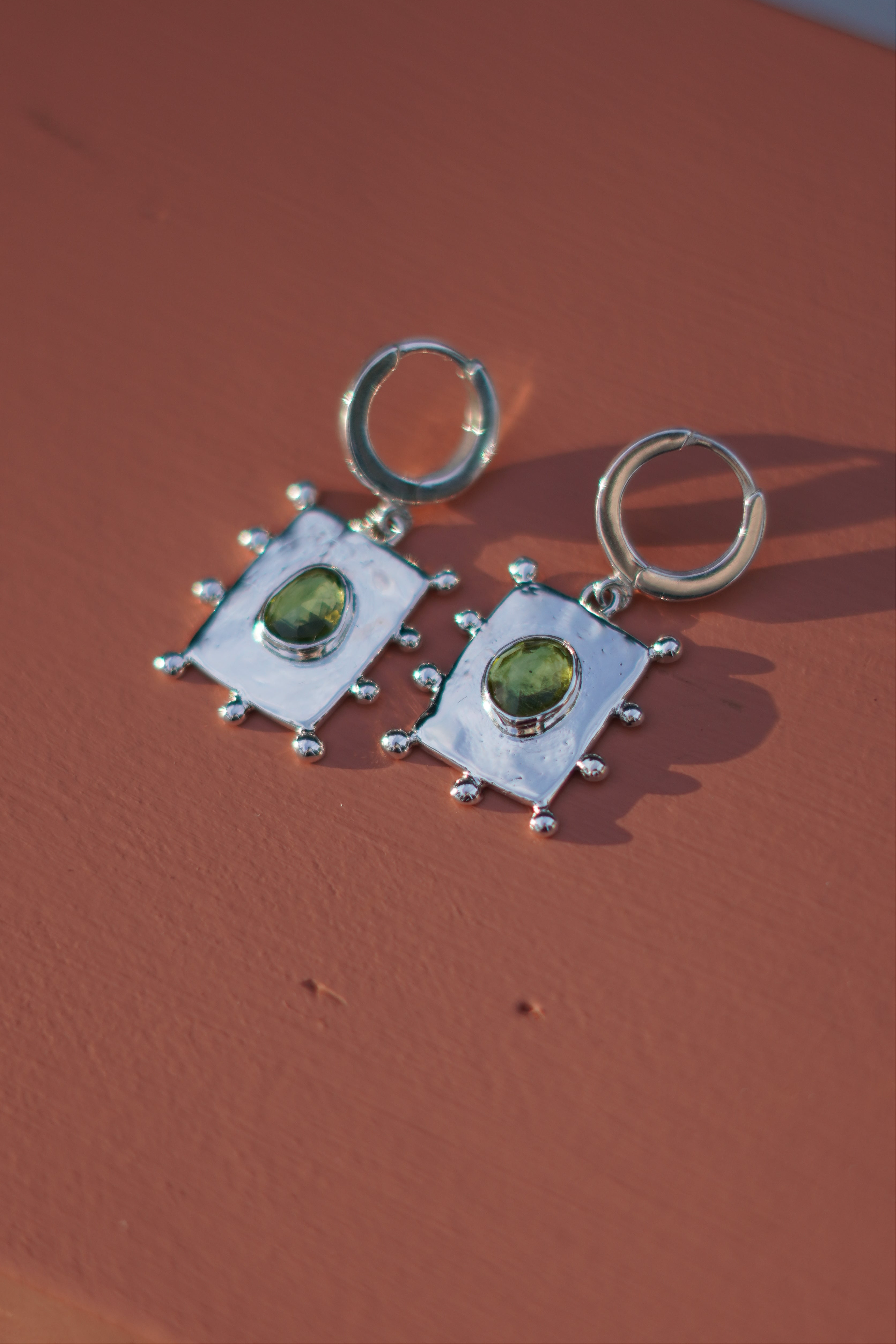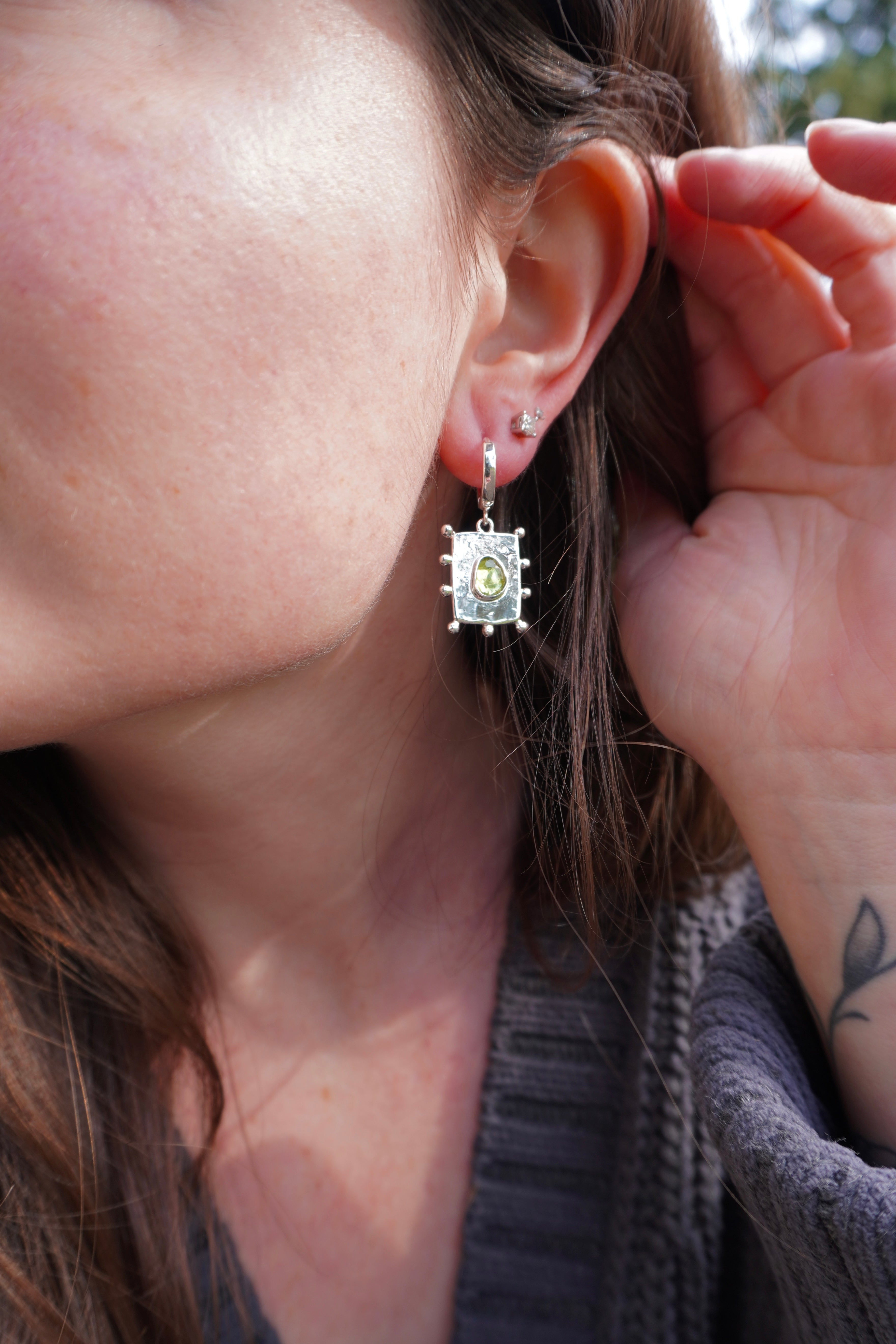 Reclaimed sterling silver earrings featuring gorgeous green faceted Peridot stones with a huggie hoop closure.