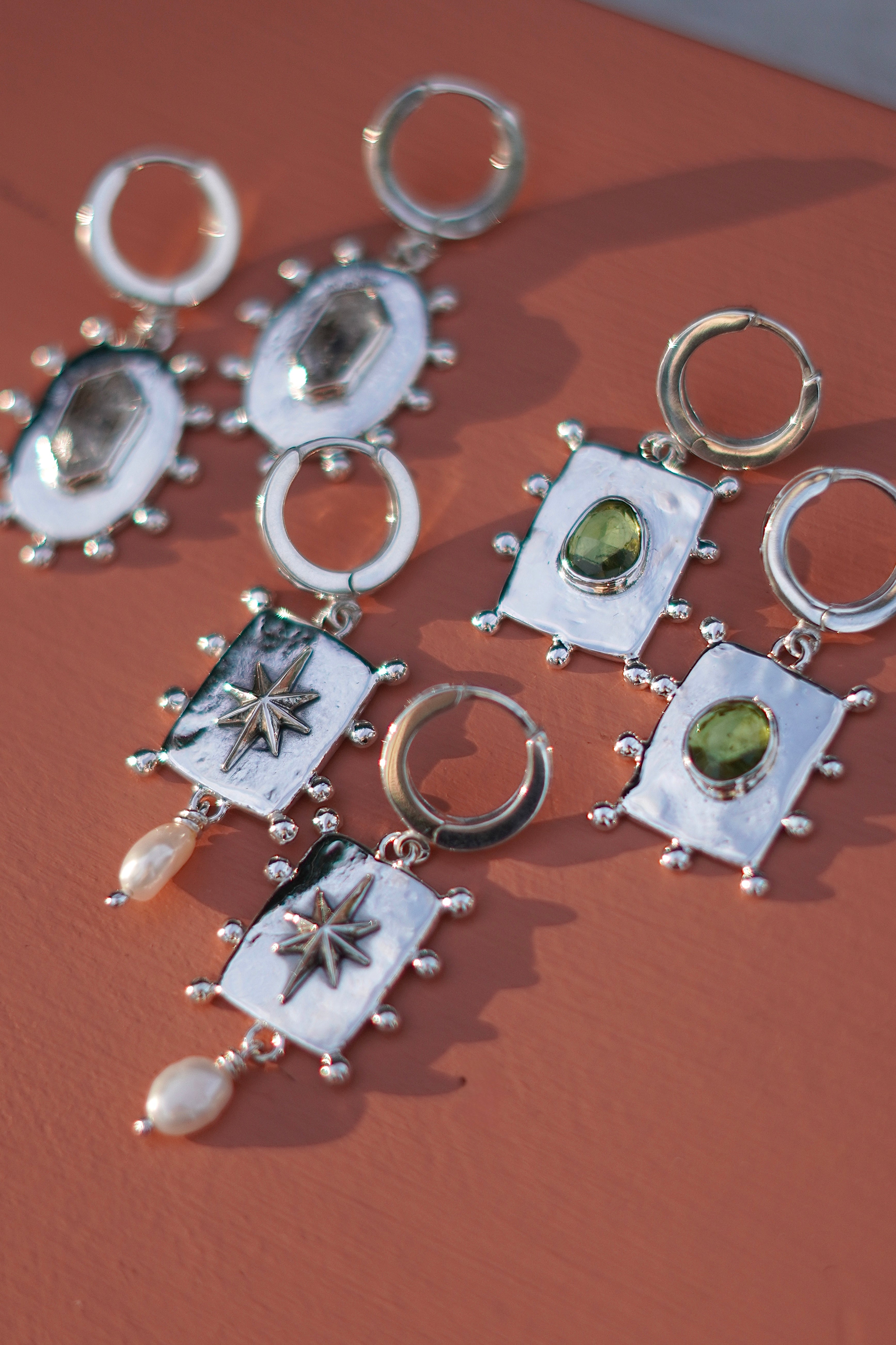 These earrings are made with reclaimed sterling silver, fine silver and genuine stones.
