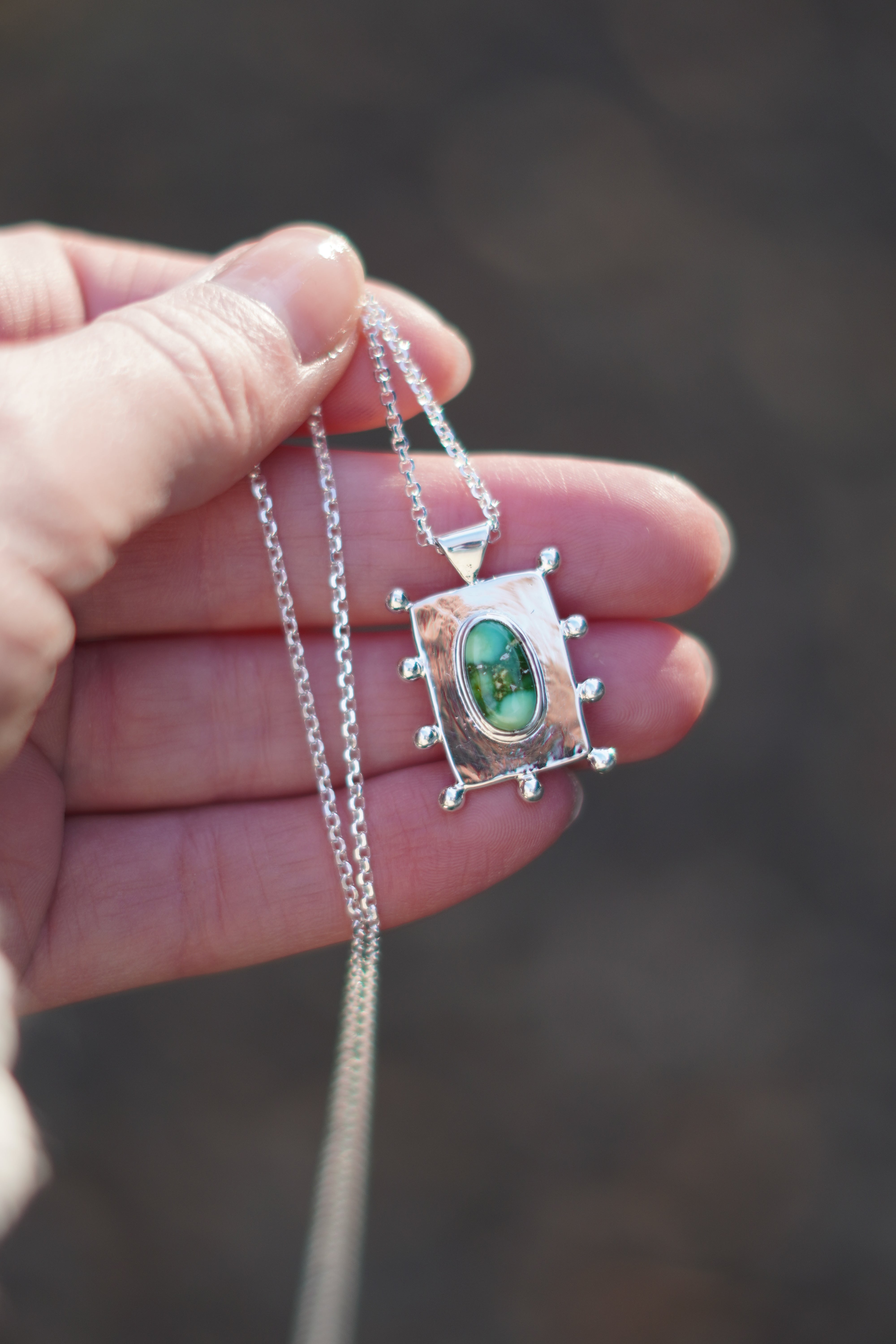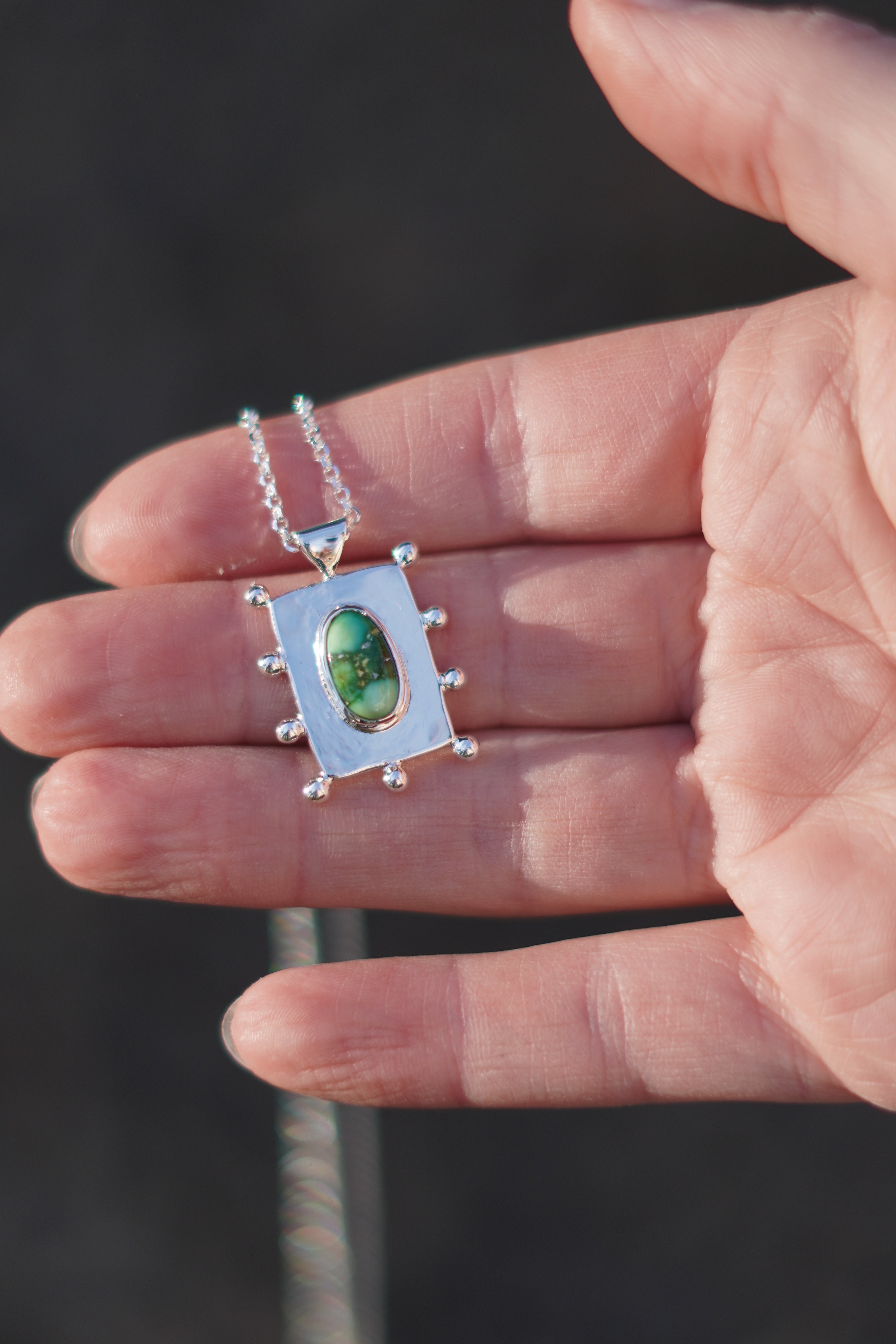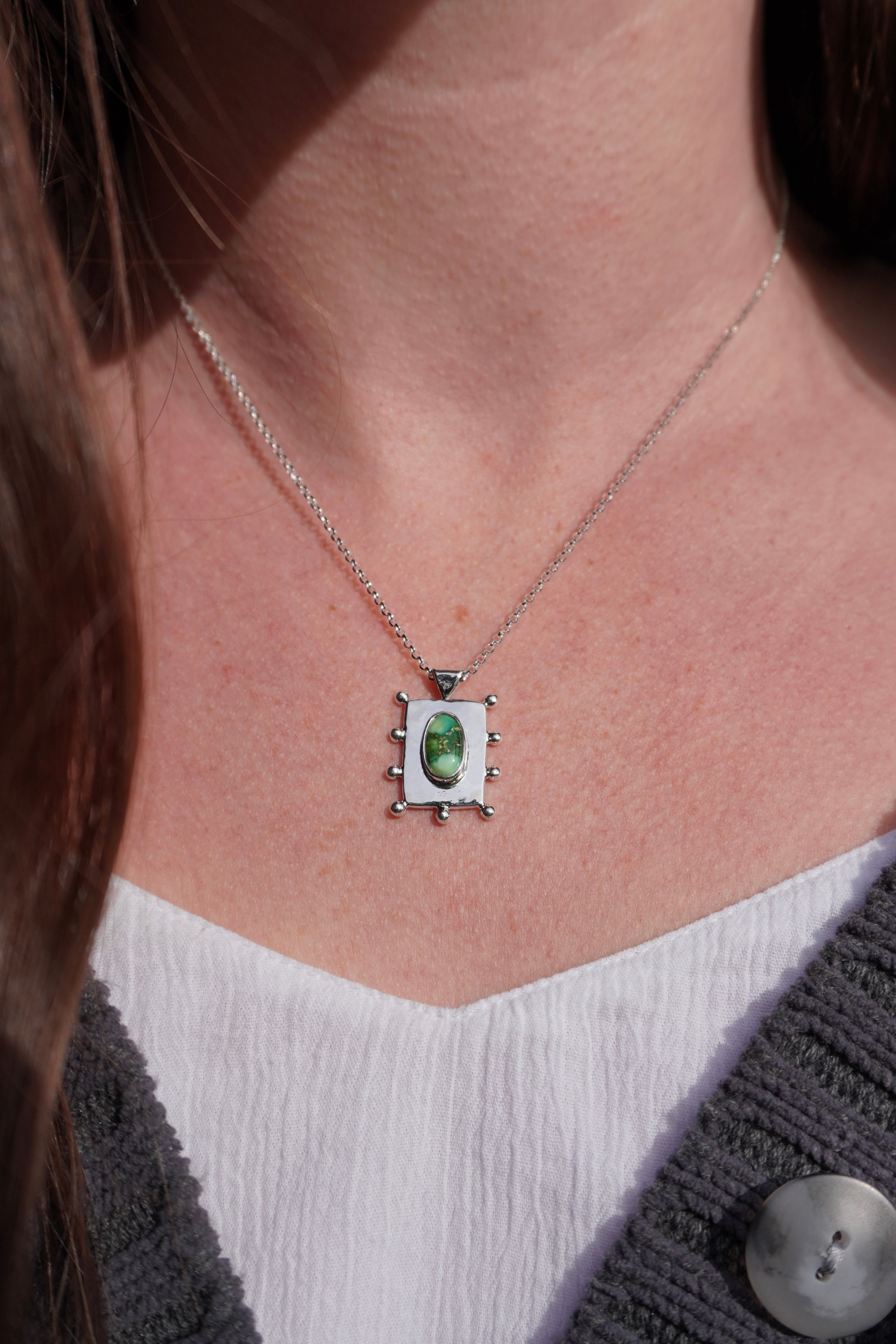 Reclaimed sterling silver rectangle pendant featuring a gorgeous Verde Valley Turquoise stone on an 18 inch Rolo chain.