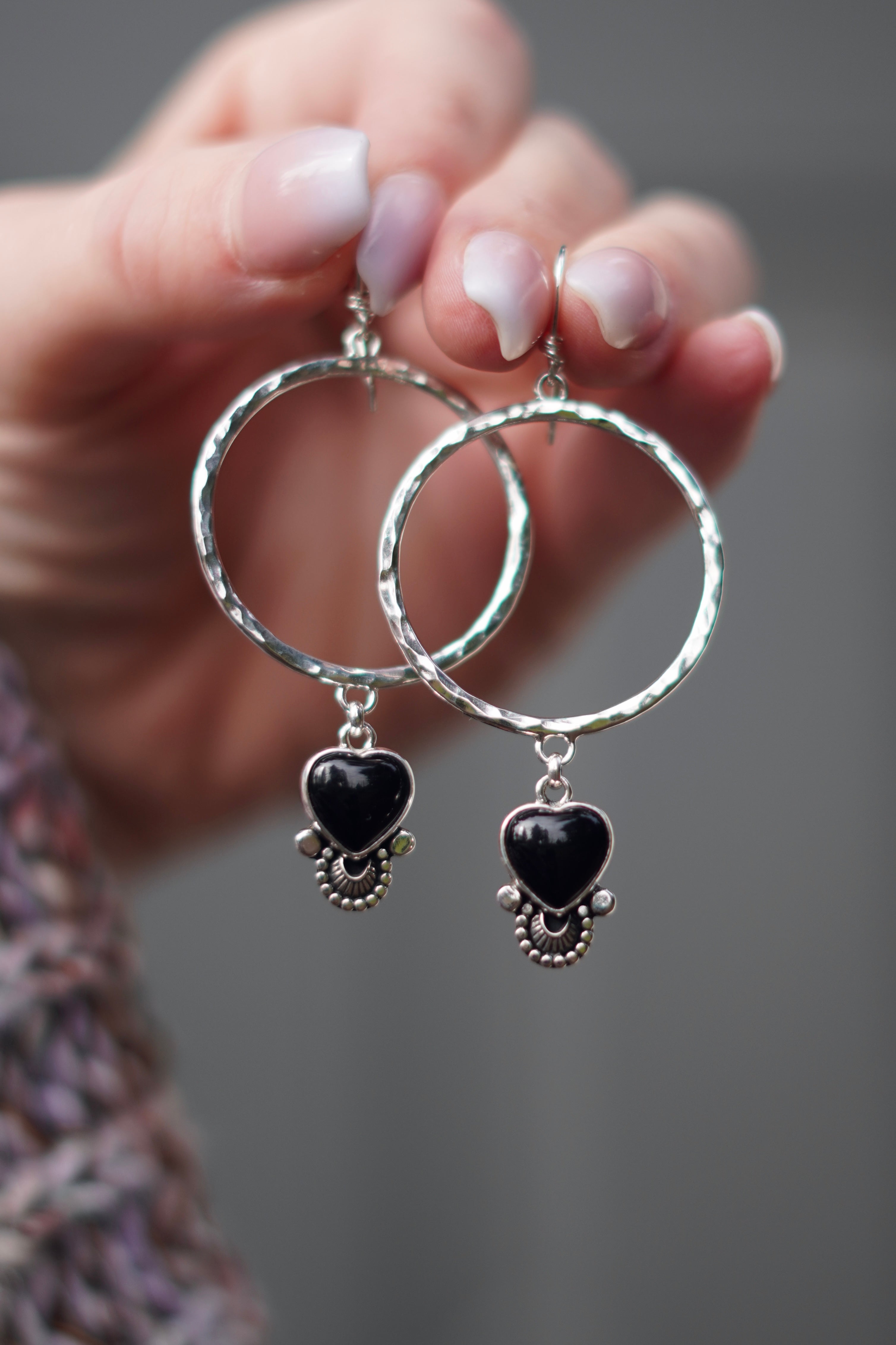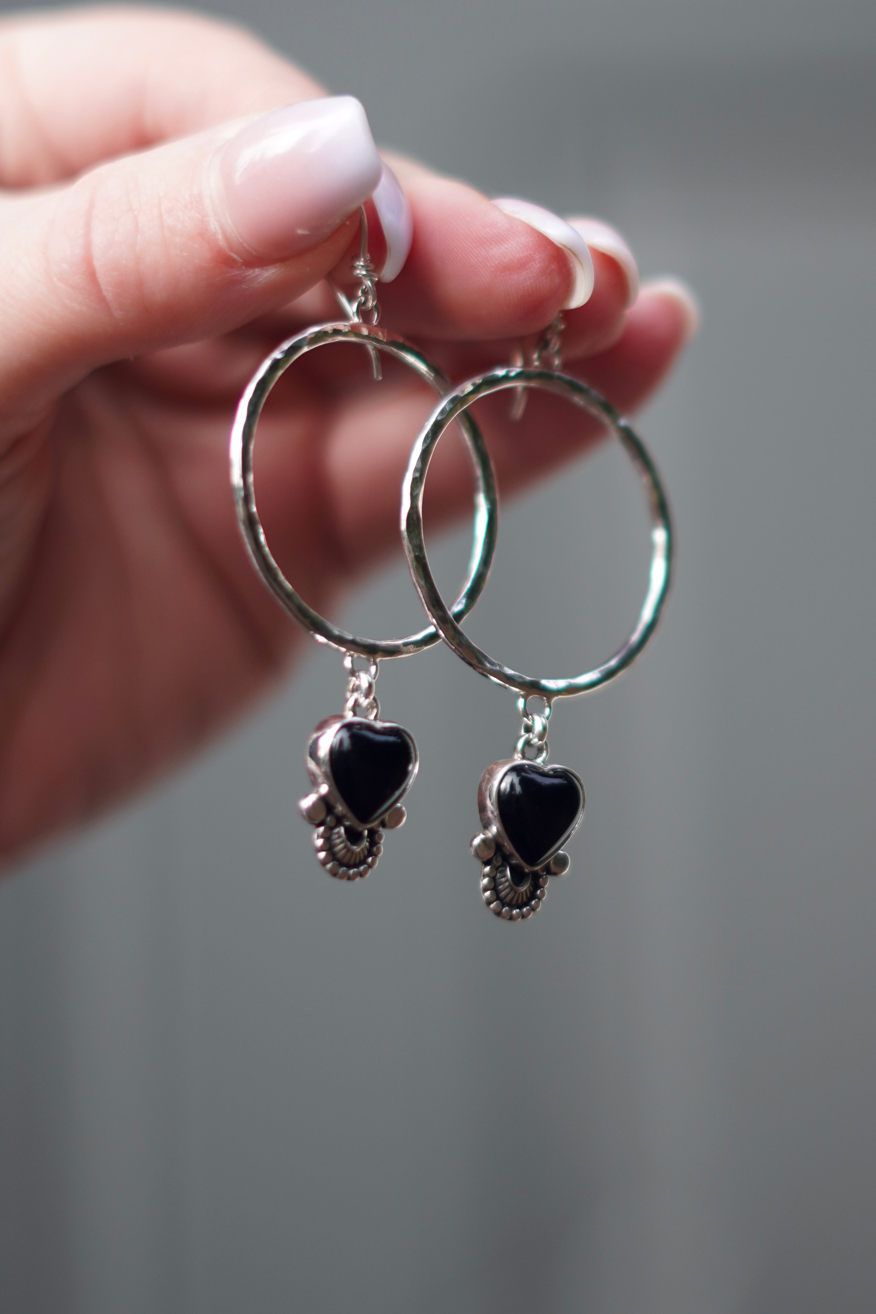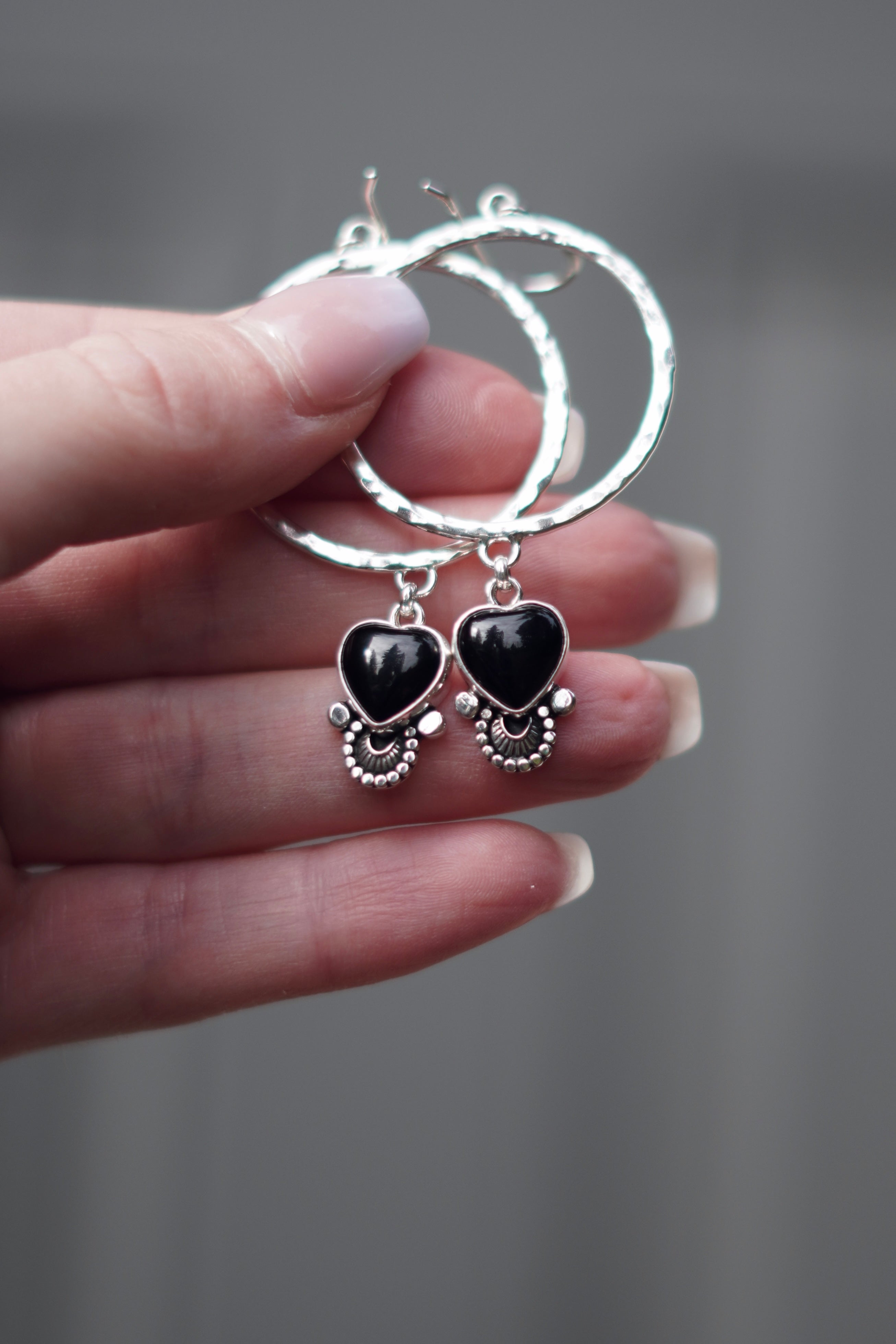 Gorgeous black Onyx hearts adorned with hand stamped details on a hammered hoop.