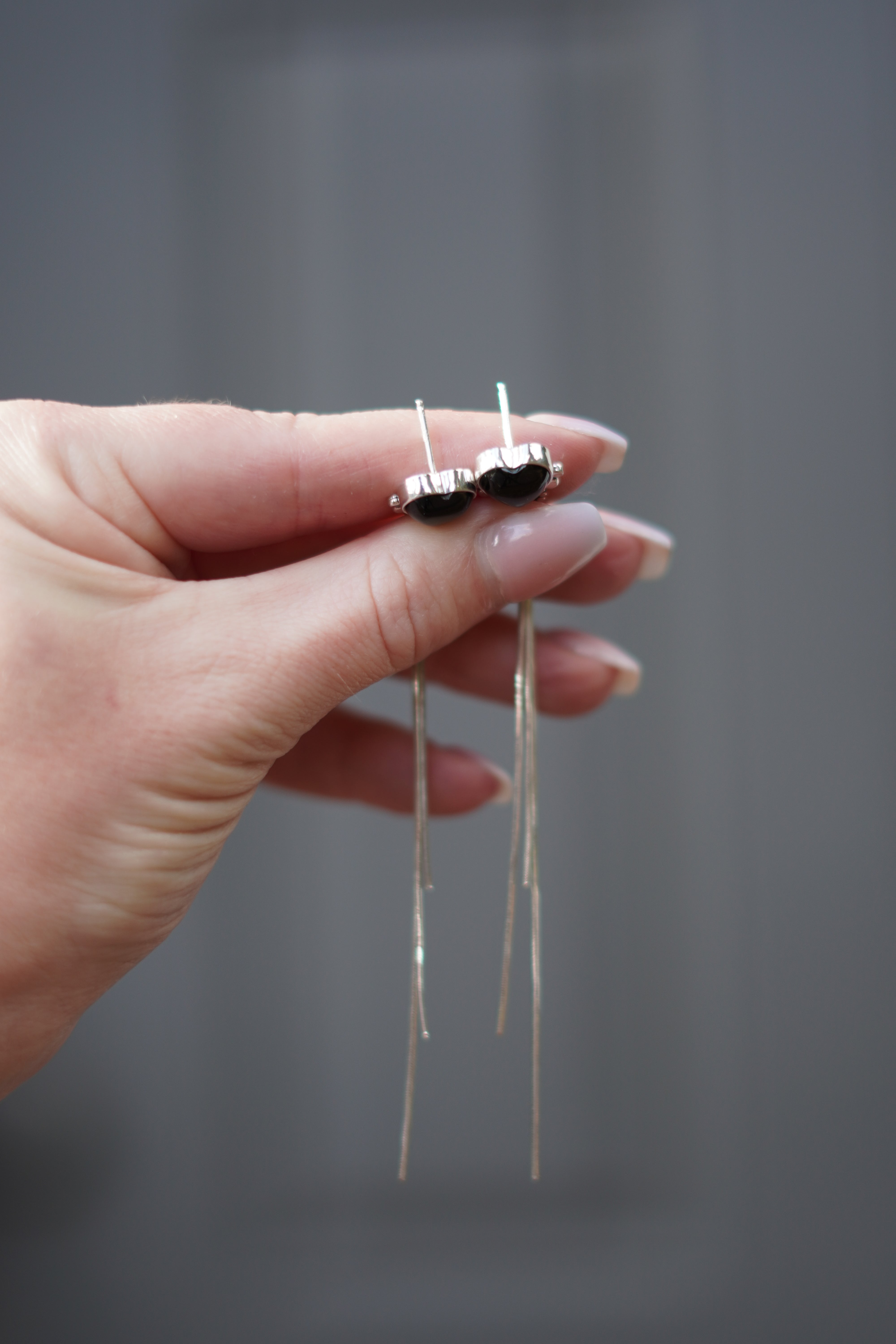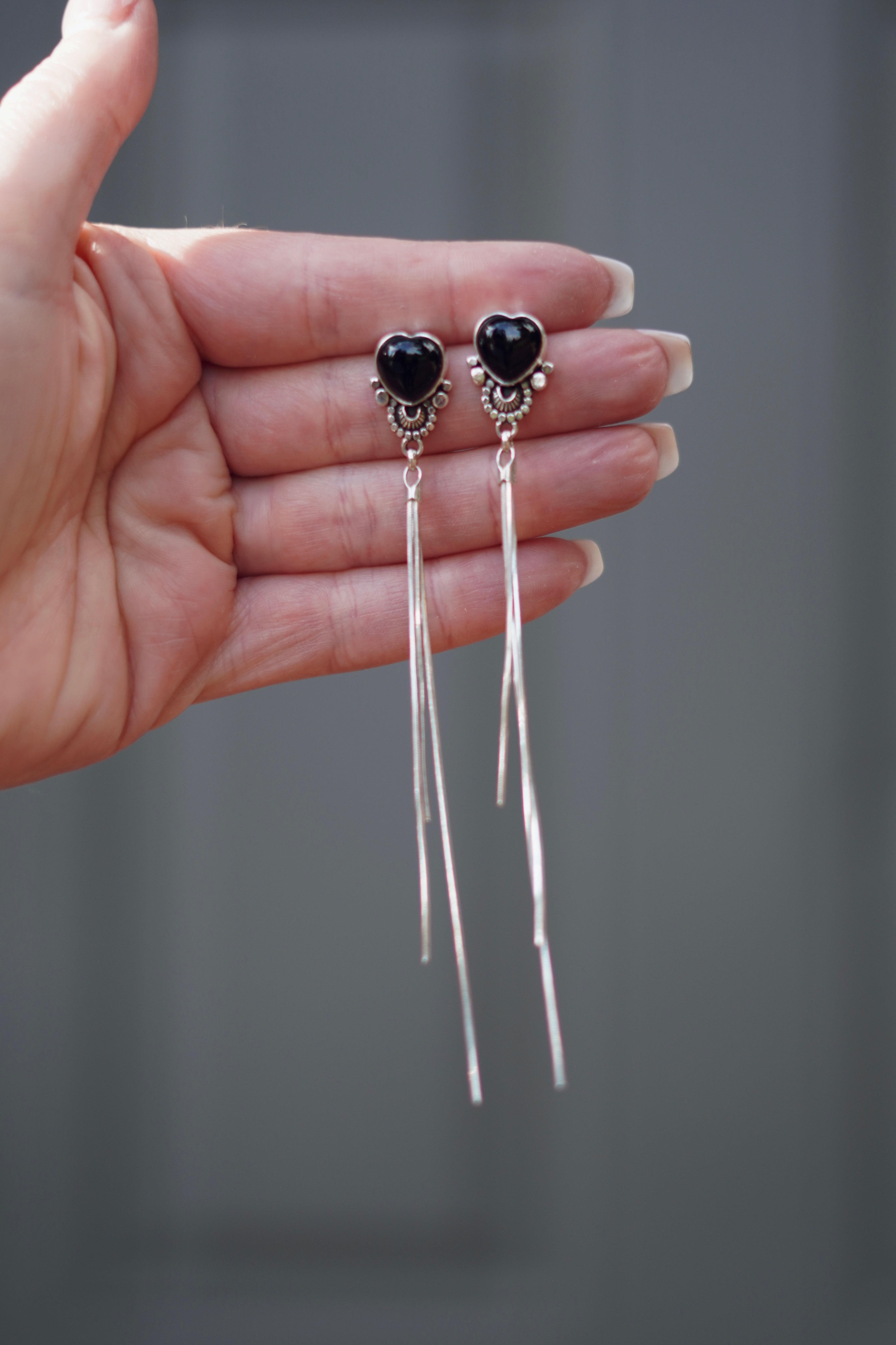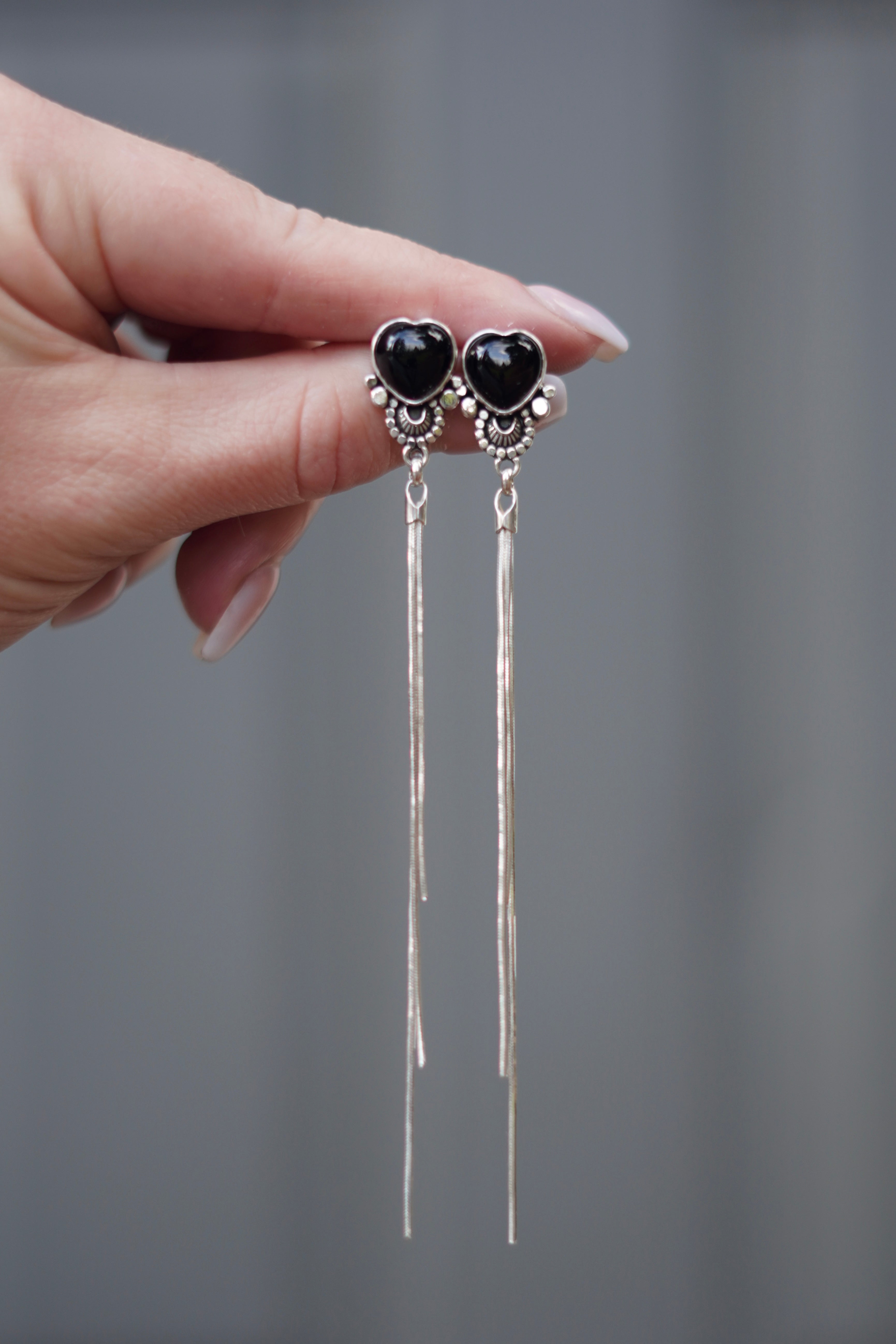 Gorgeous black Onyx hearts adorned with hand stamped details and a hammered beaded border and long silver snake chain fringe.