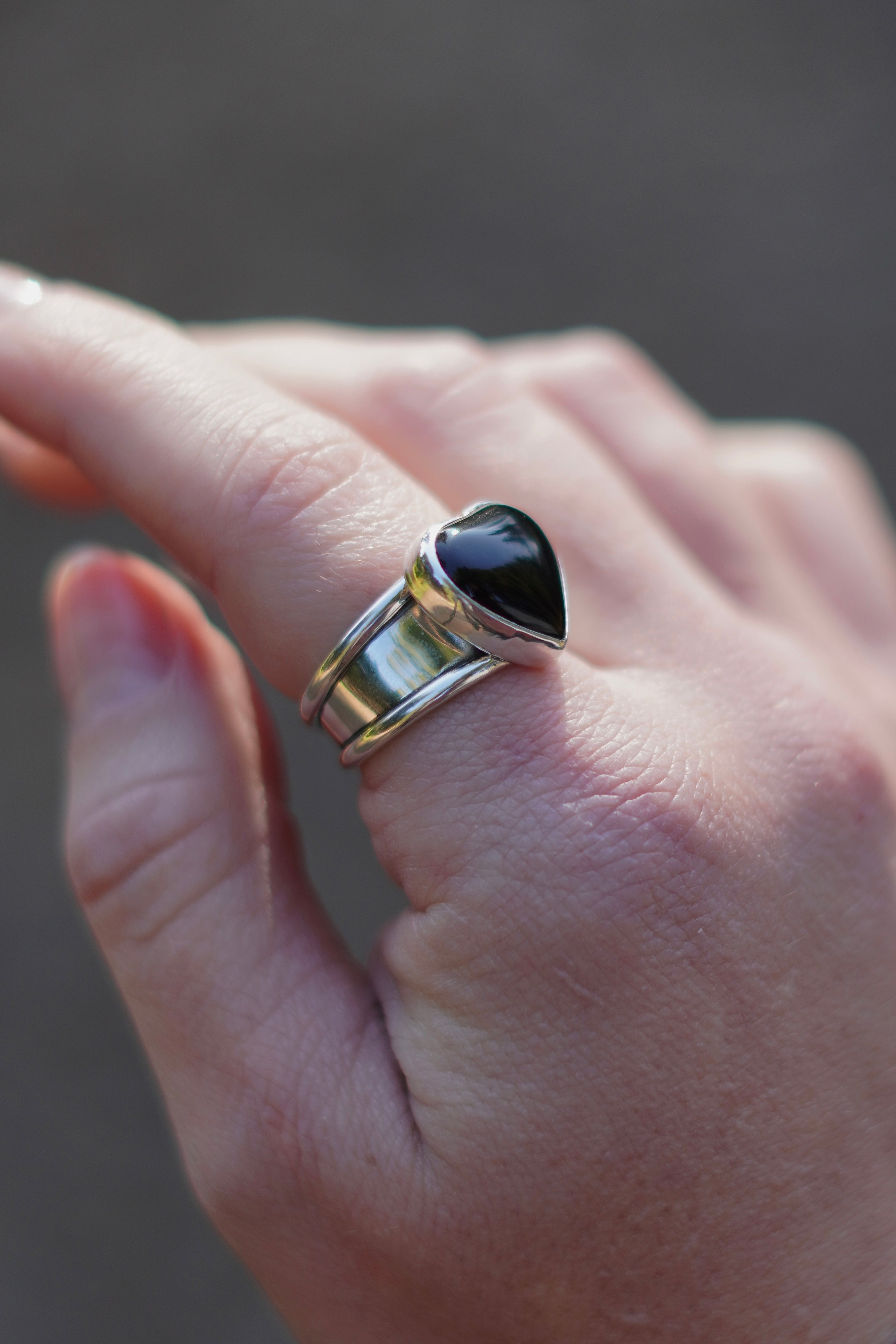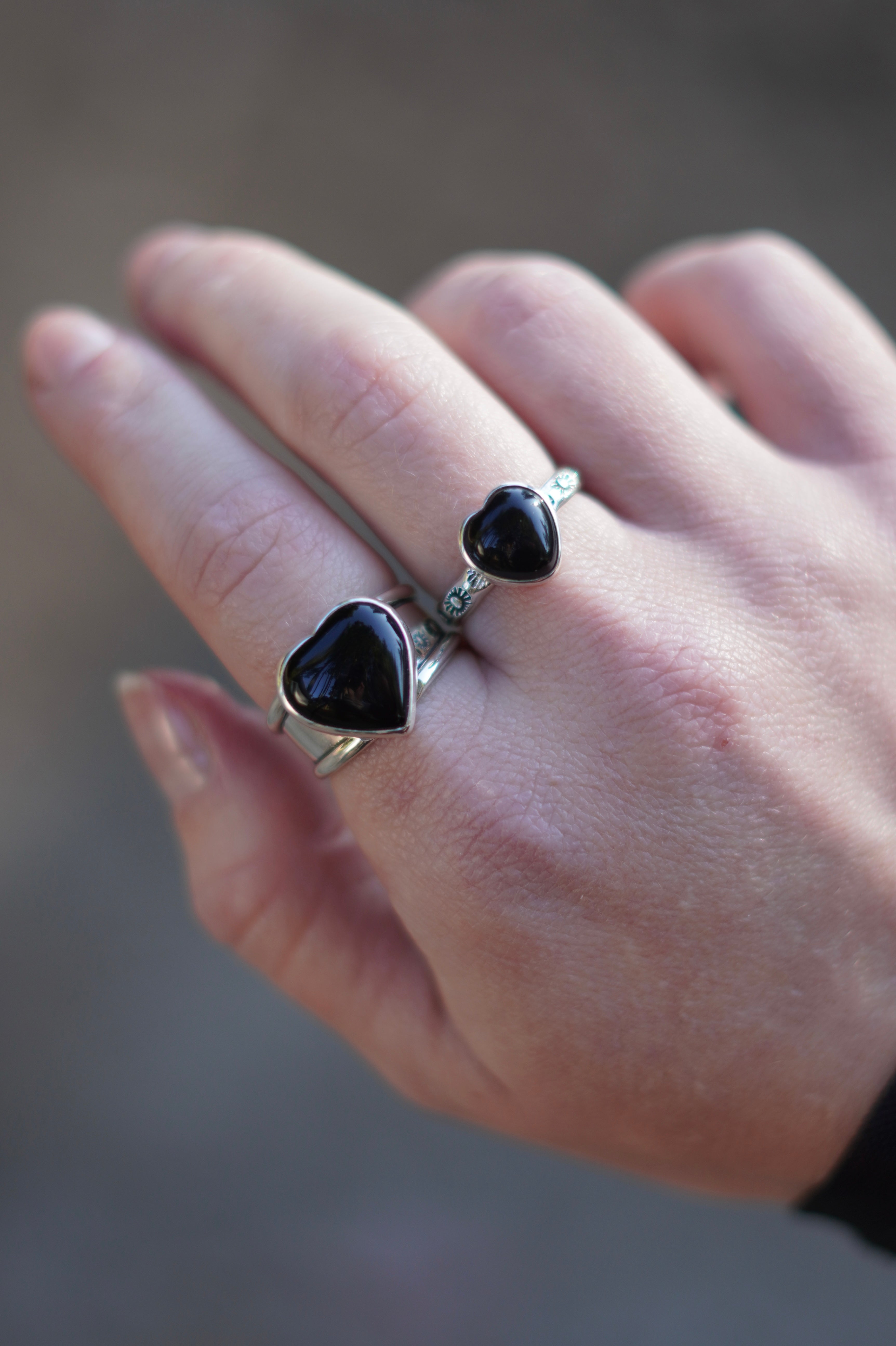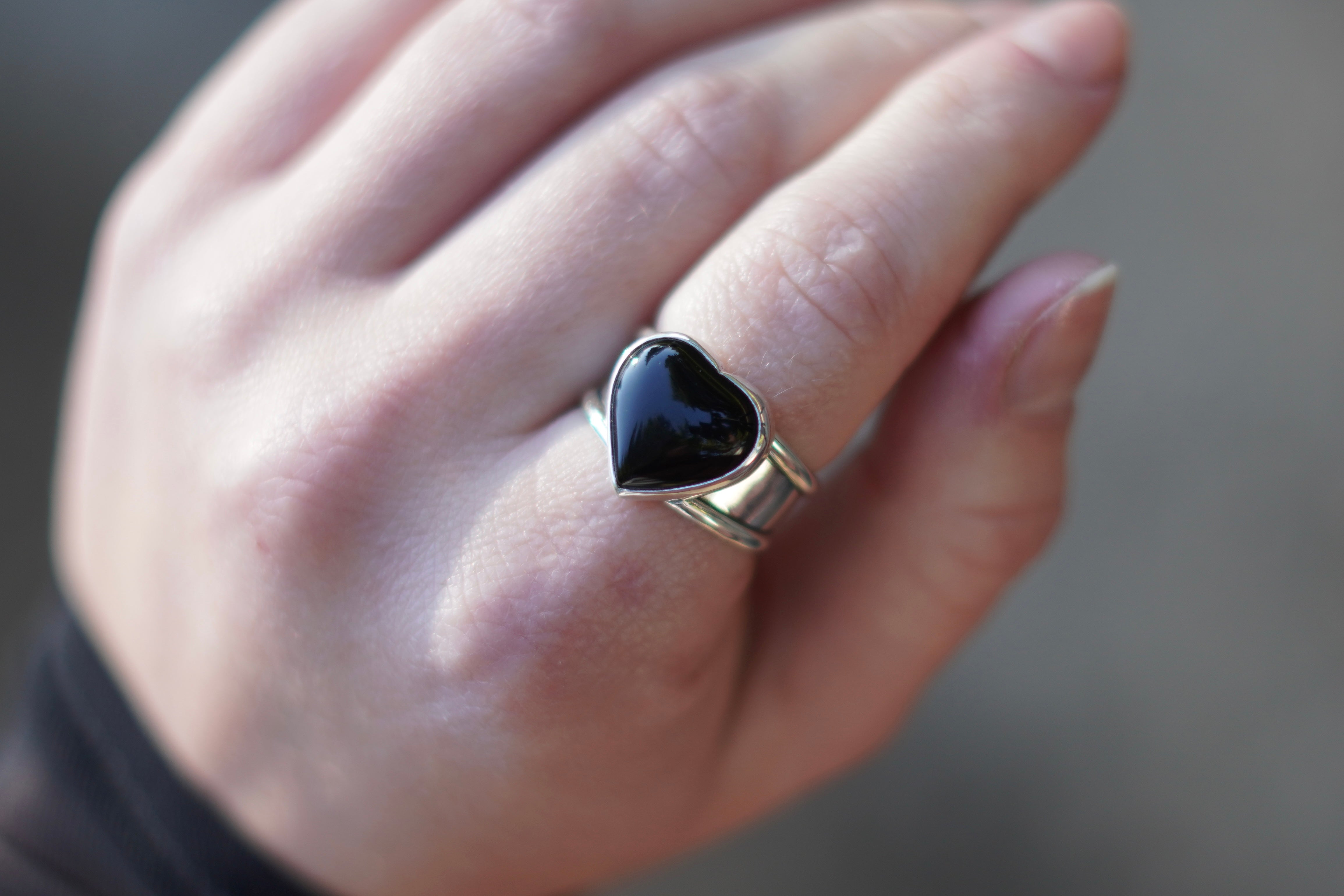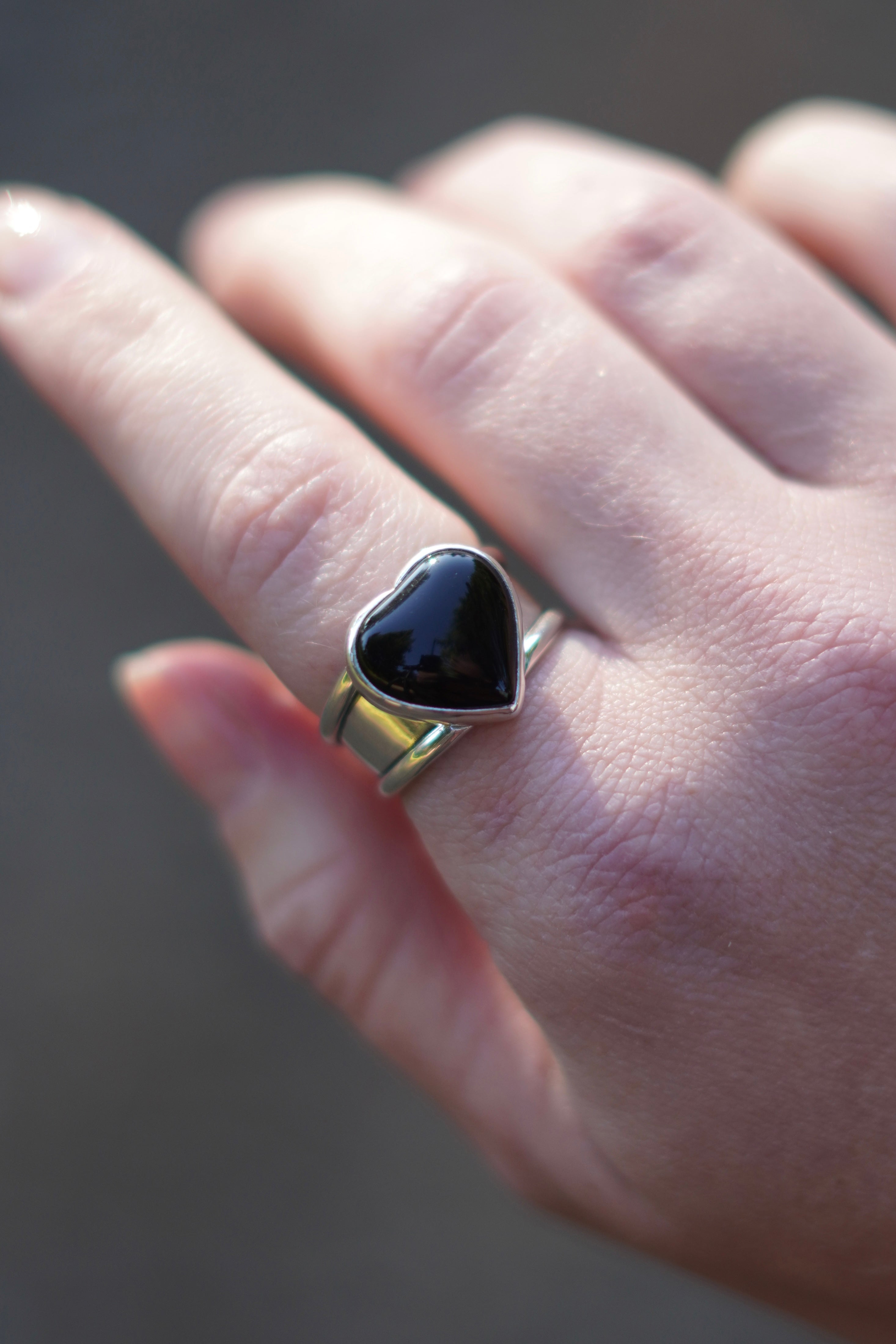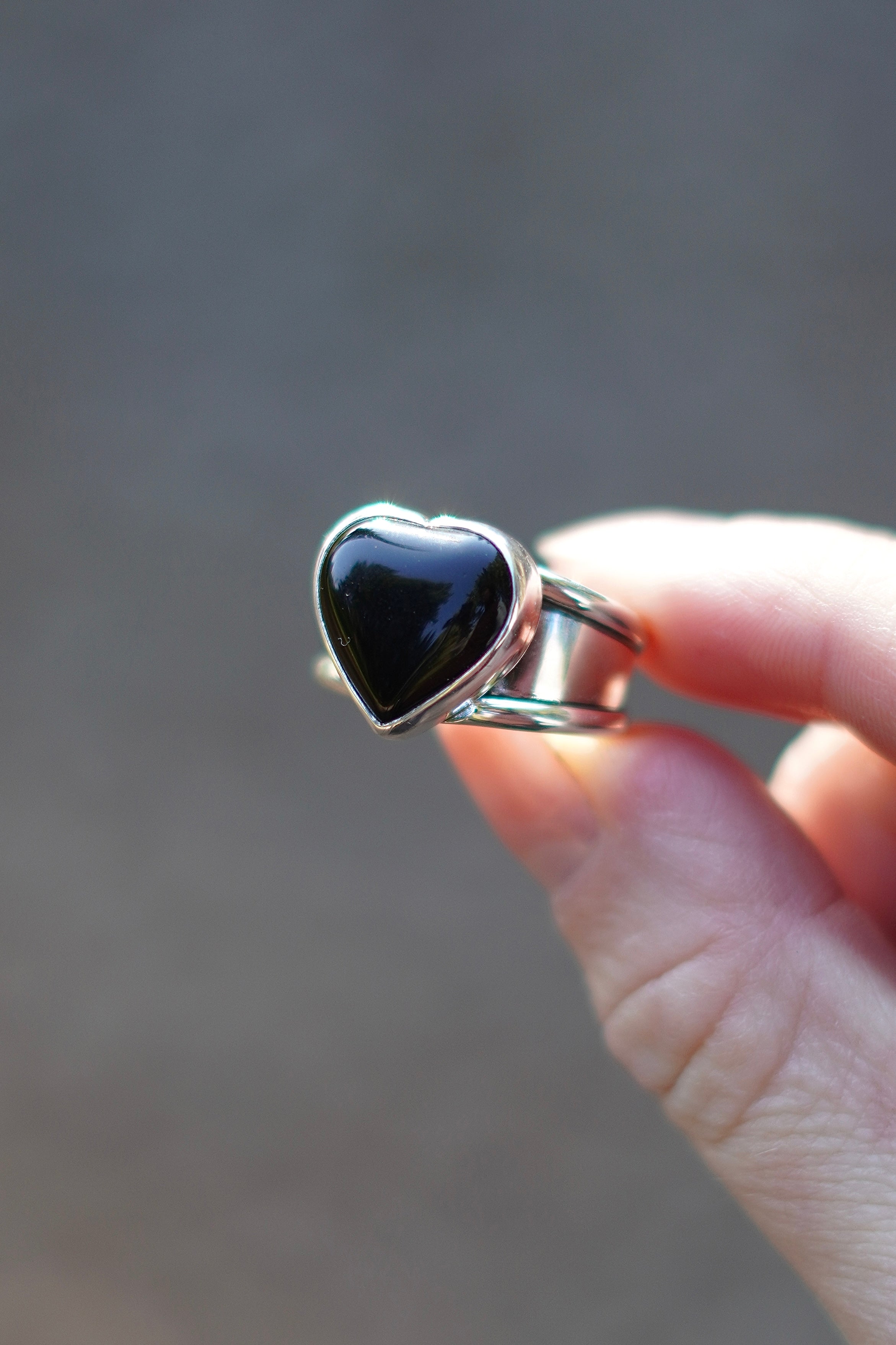 Gorgeous black Onyx Heart in a simple setting on a shiny wide band ring shank.