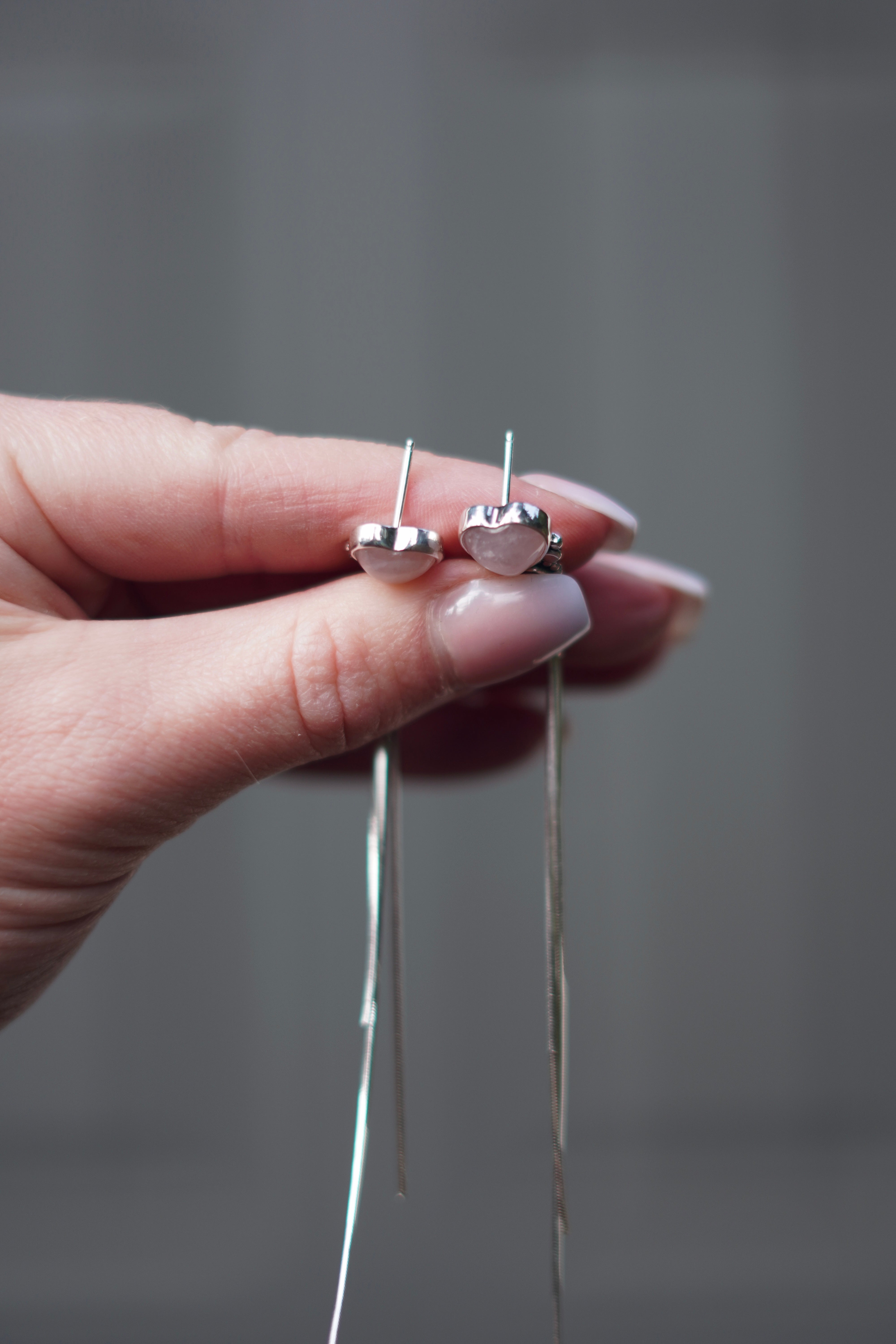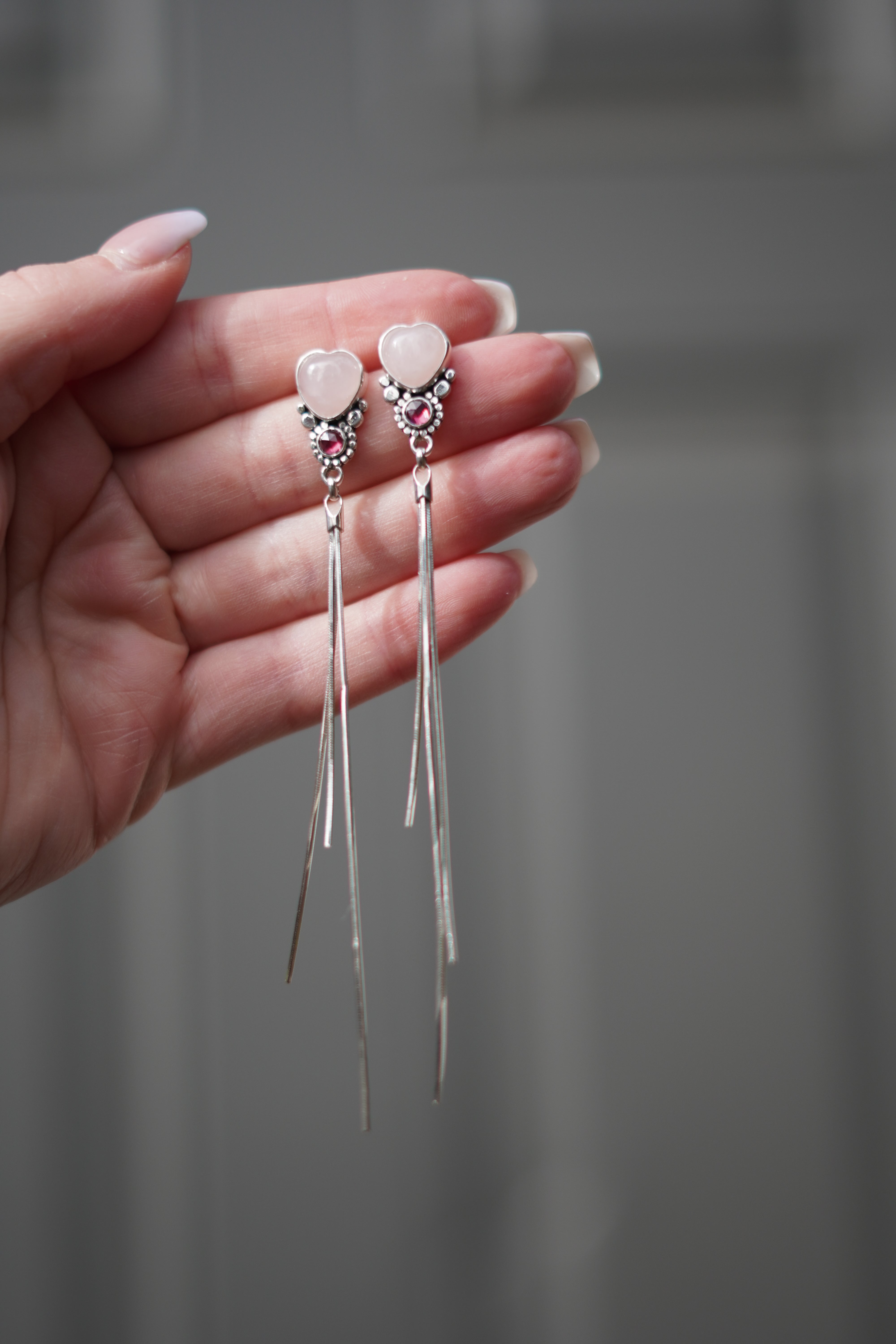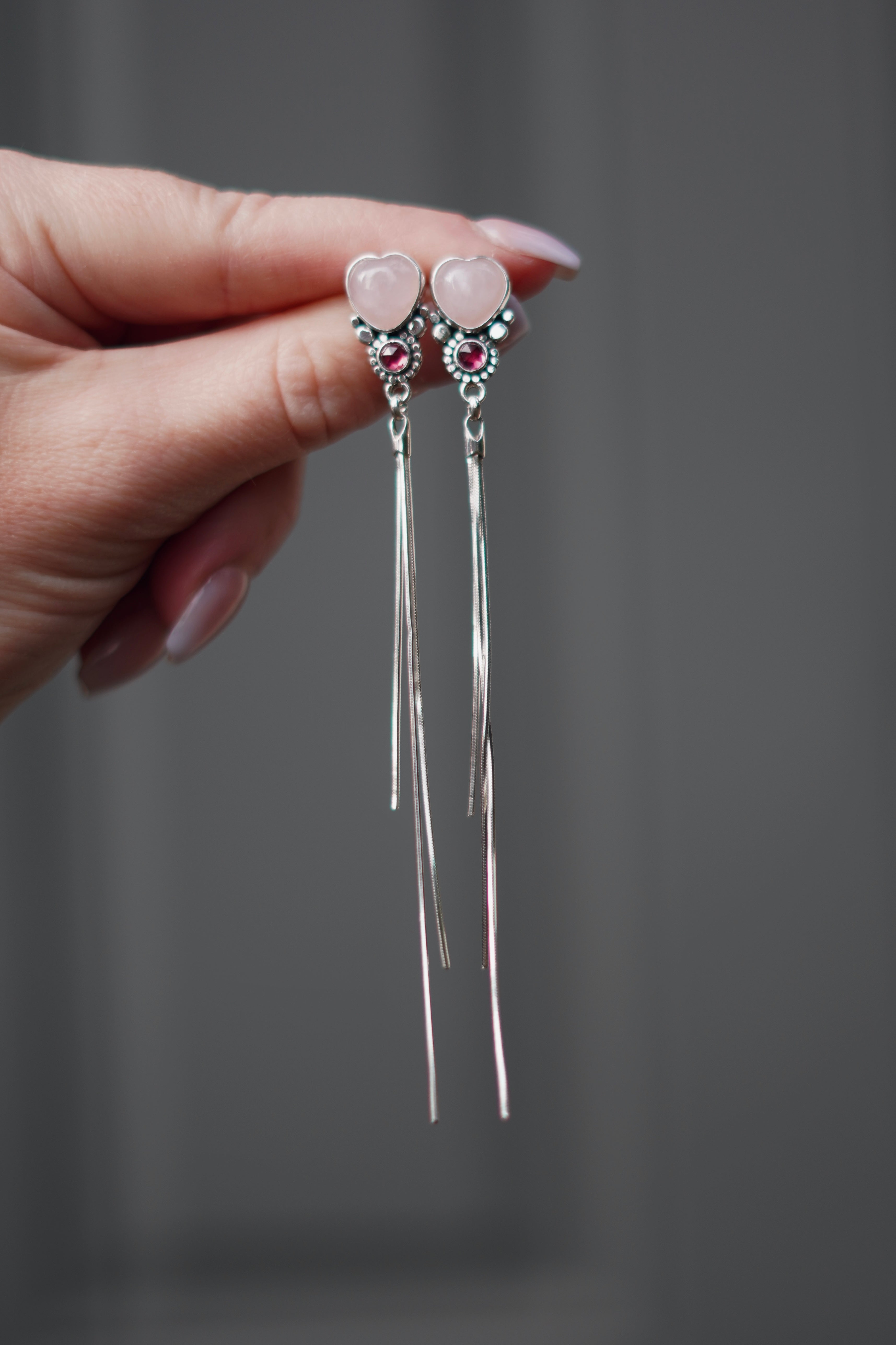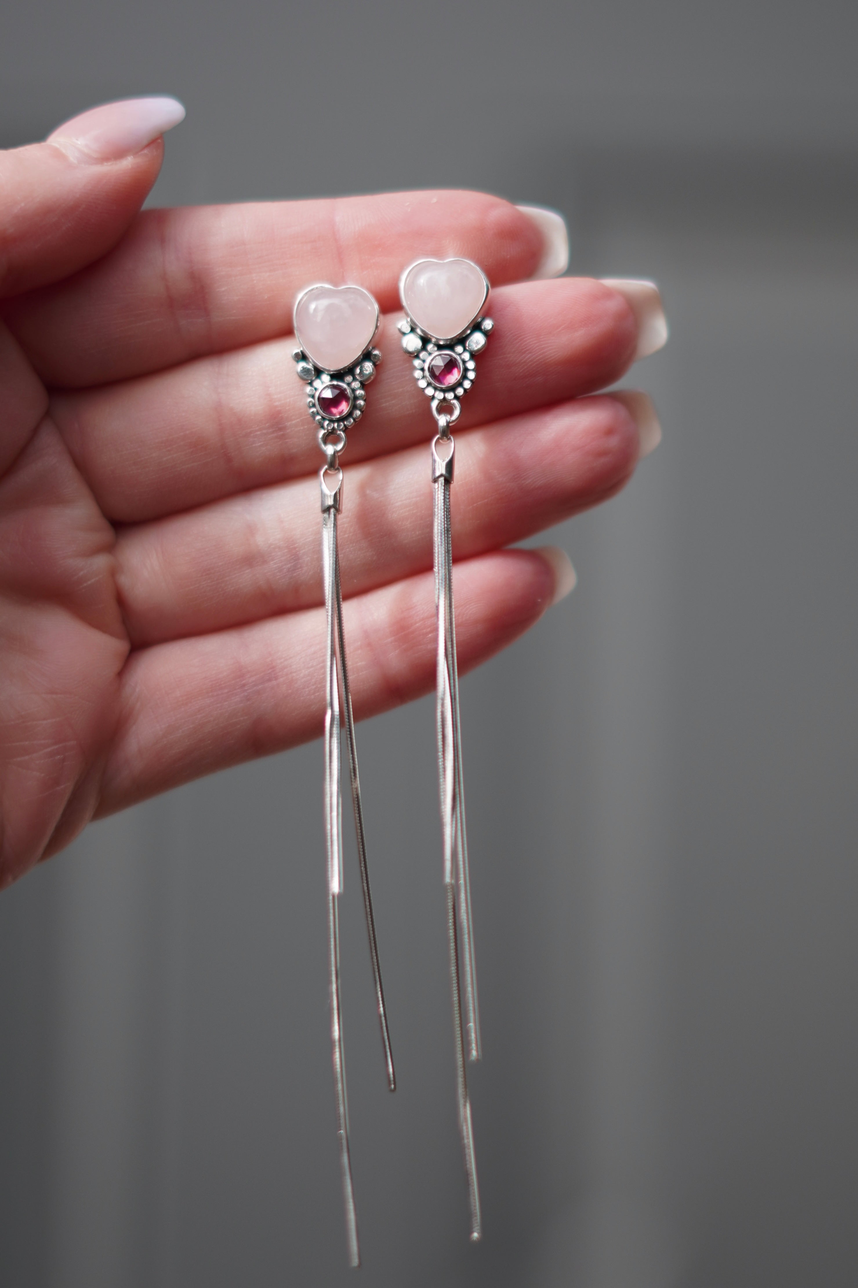 Gorgeous pink Rose Quartz hearts adorned faceted Rhodolite Garnet stones with a hammered beaded border and long silver snake chain fringe.