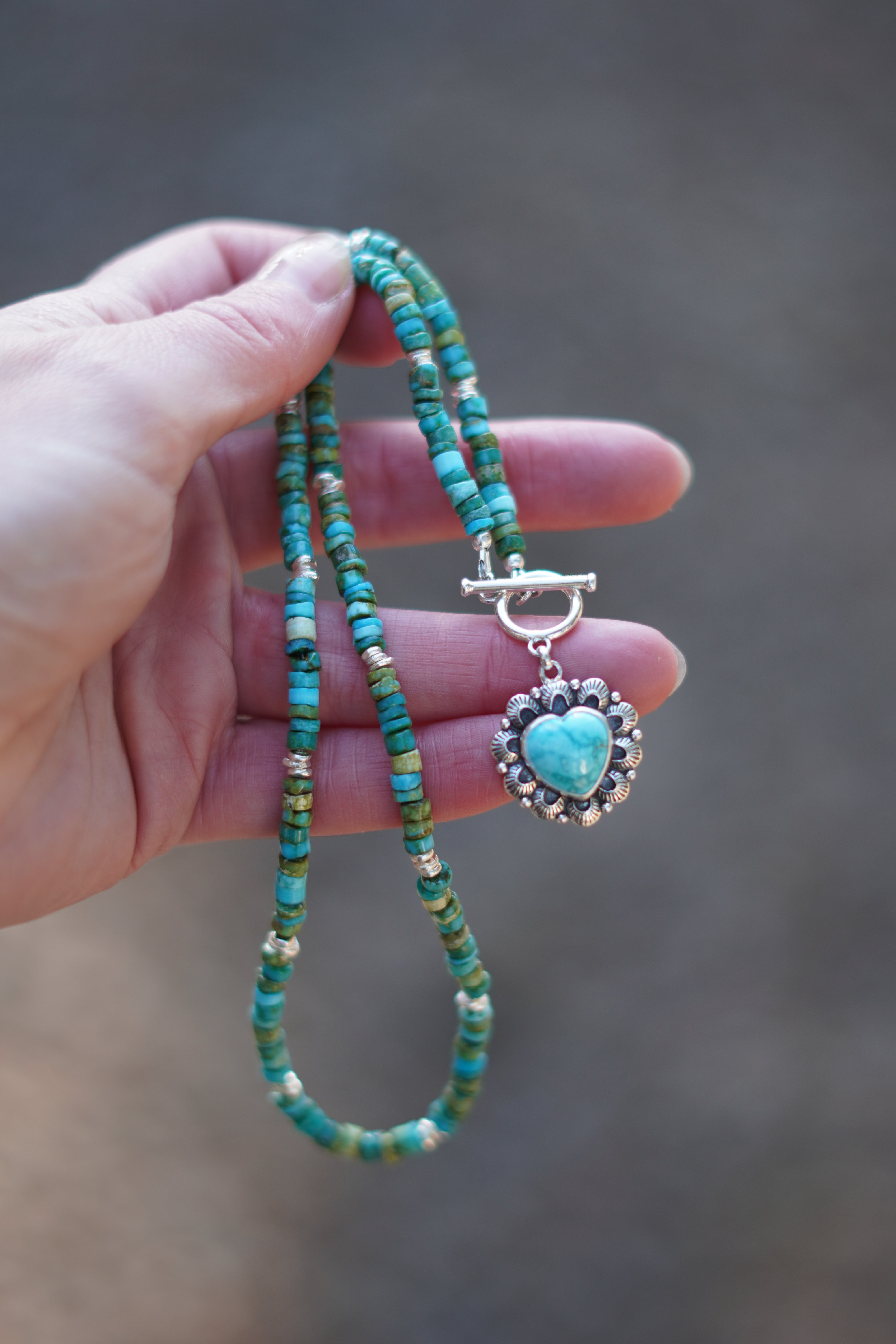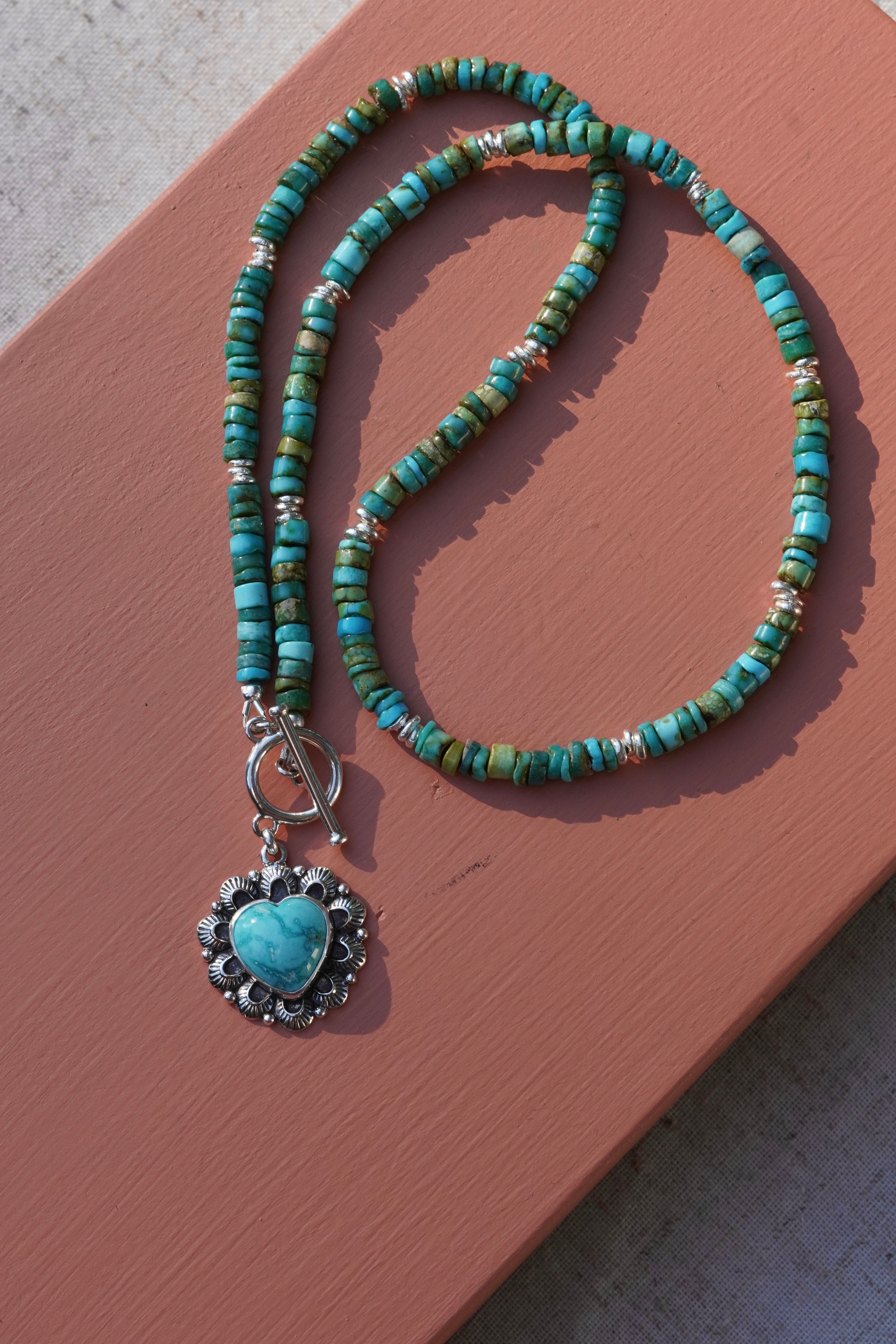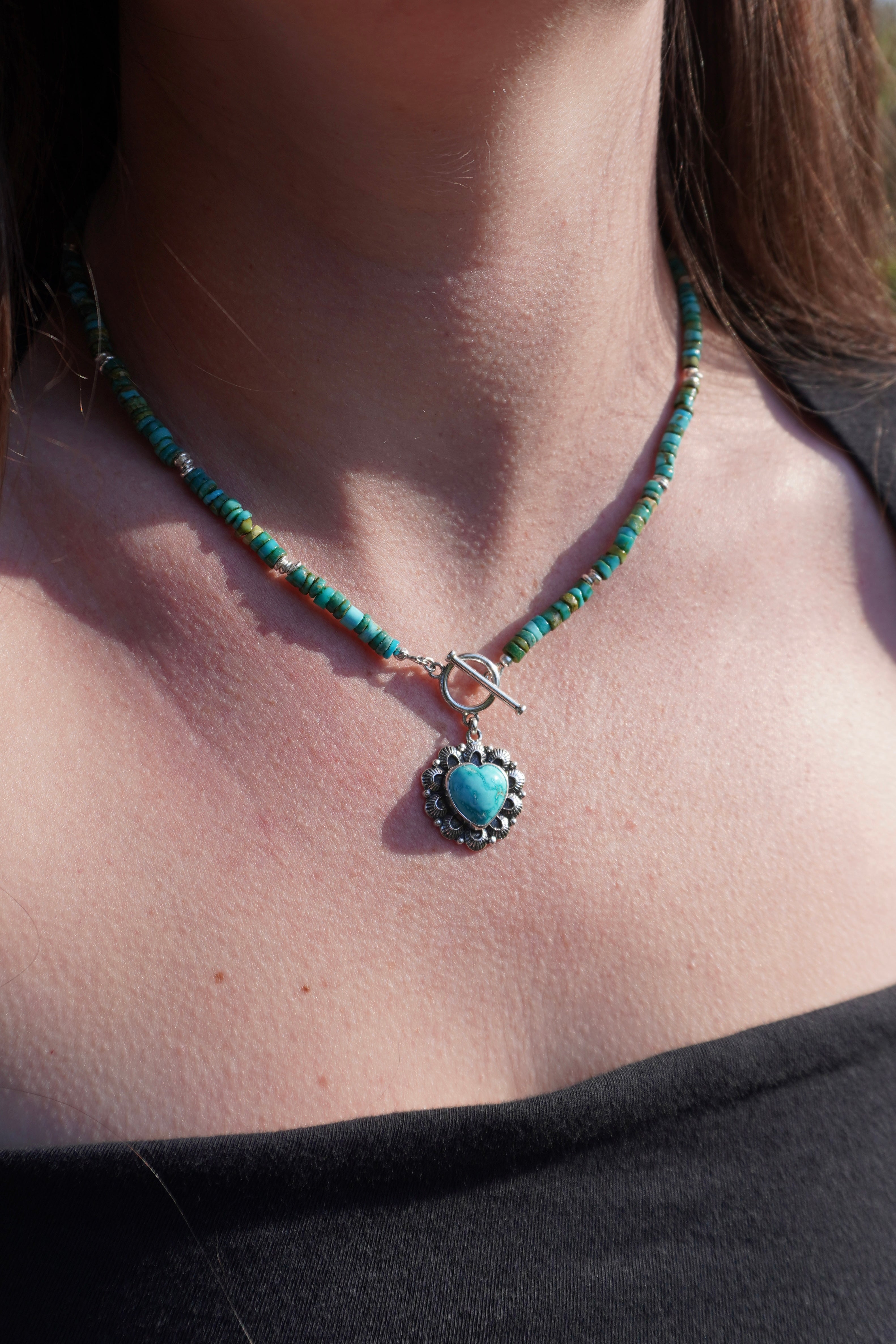 Absolutely stunning Sonoran Mountain Turquoise beads with silver bead accents display a gorgeous Fox Turquoise heart pendant with hand stamped details with a cute toggle clasp closure in the front.