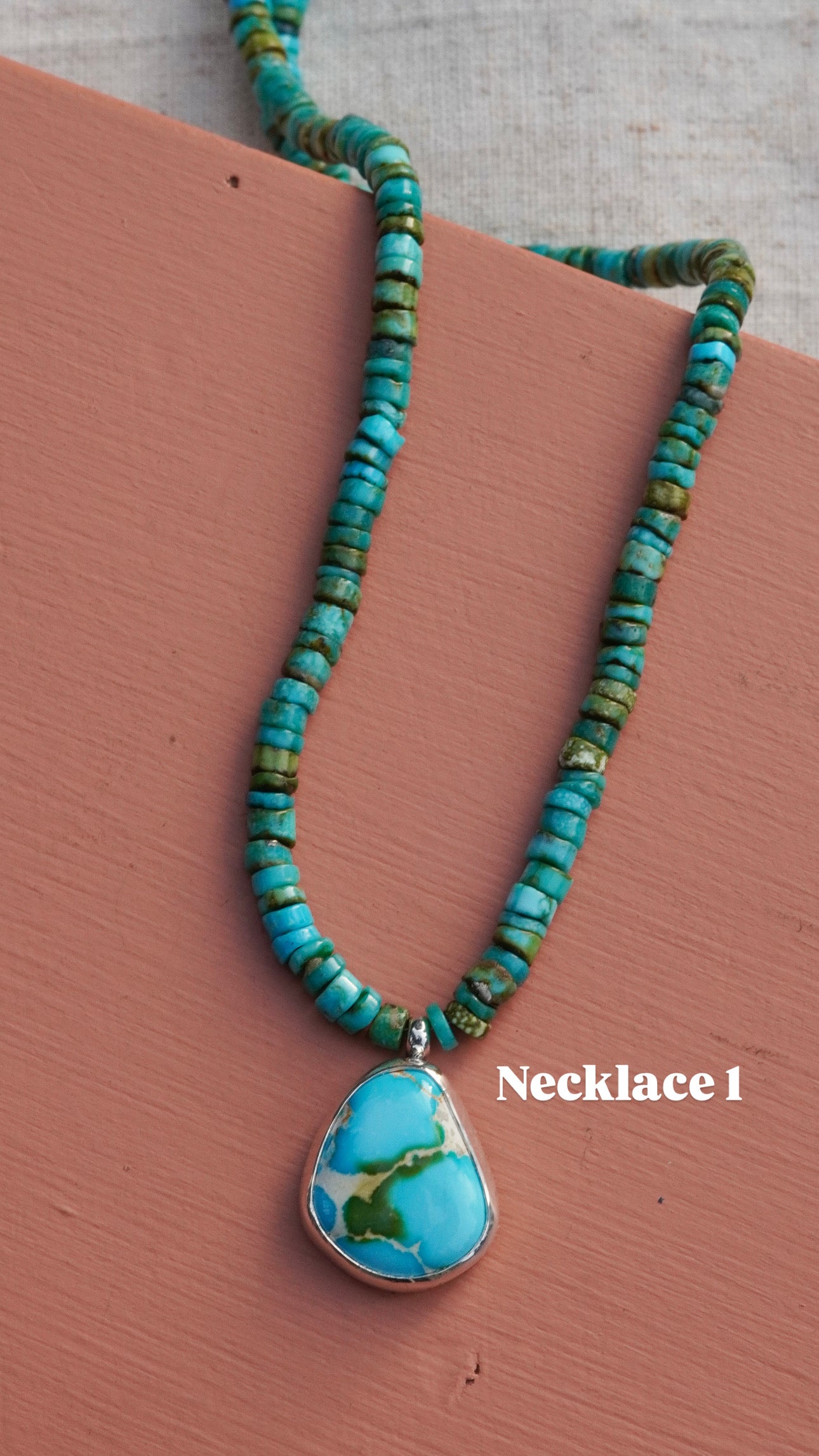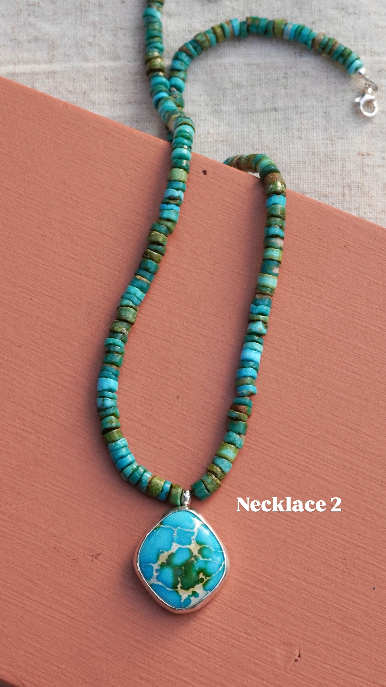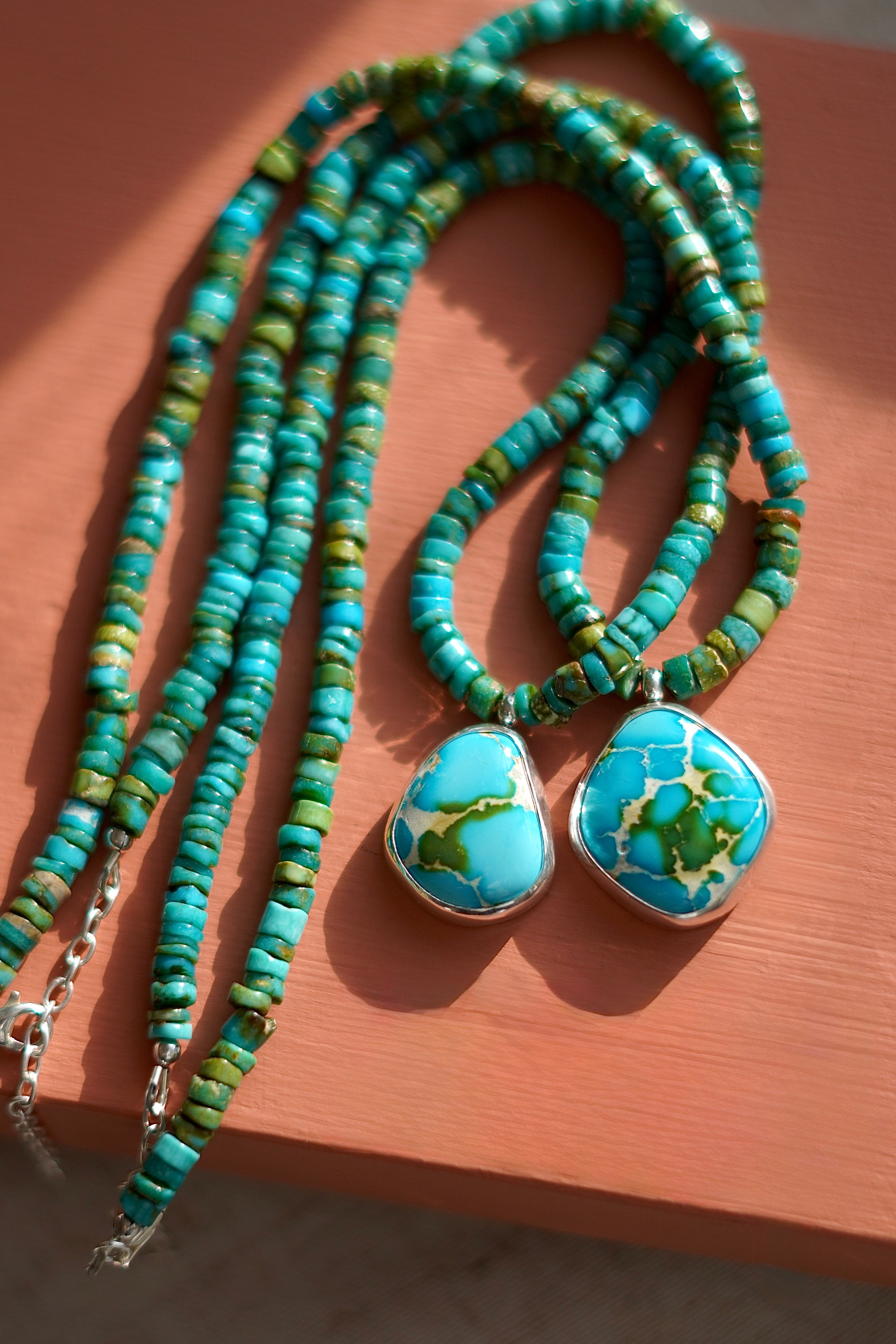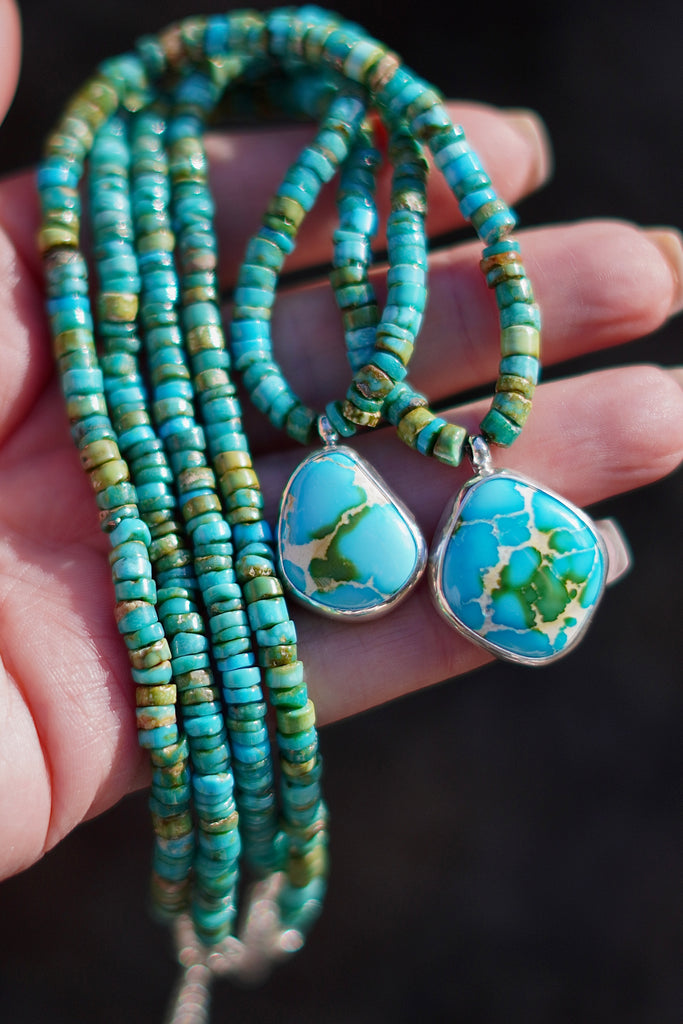 Stunning Sonoran Mountain Turquoise pendants with a simple silver settings hang from strings of Sonoran Mountain Turquoise 4.5 mm Heishi beads. They are adjustable between 16.5 and 18.5 inches.