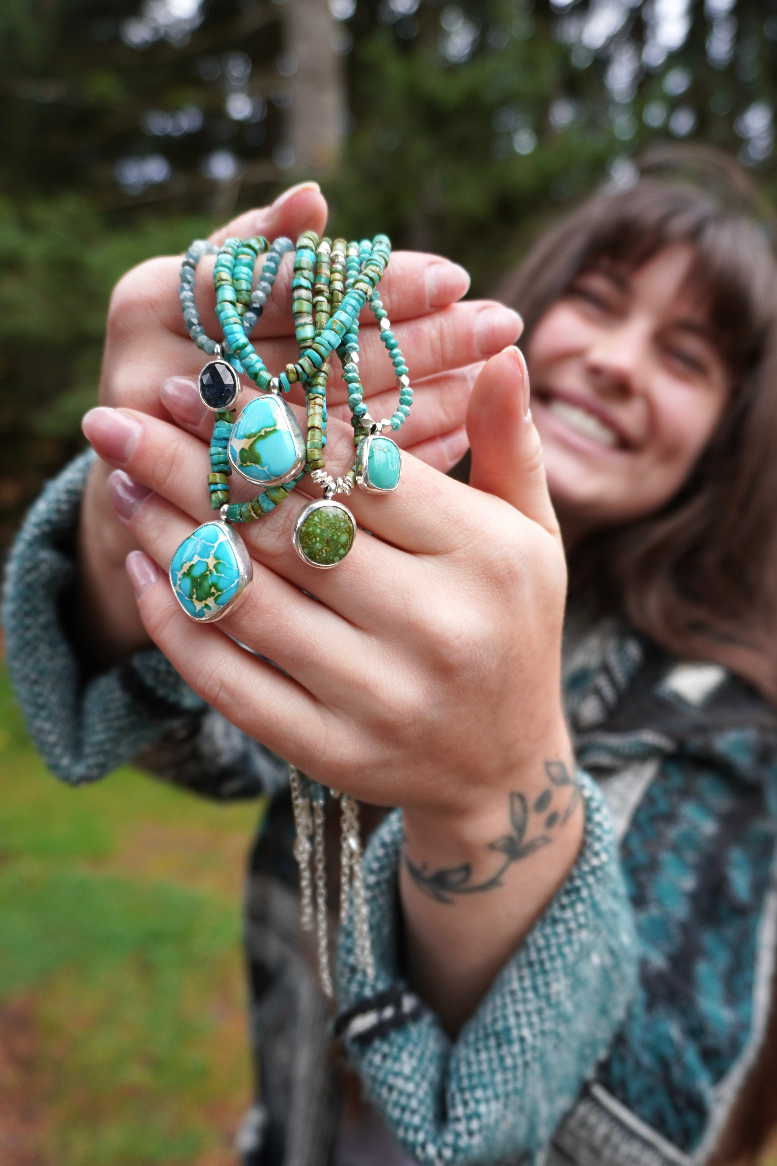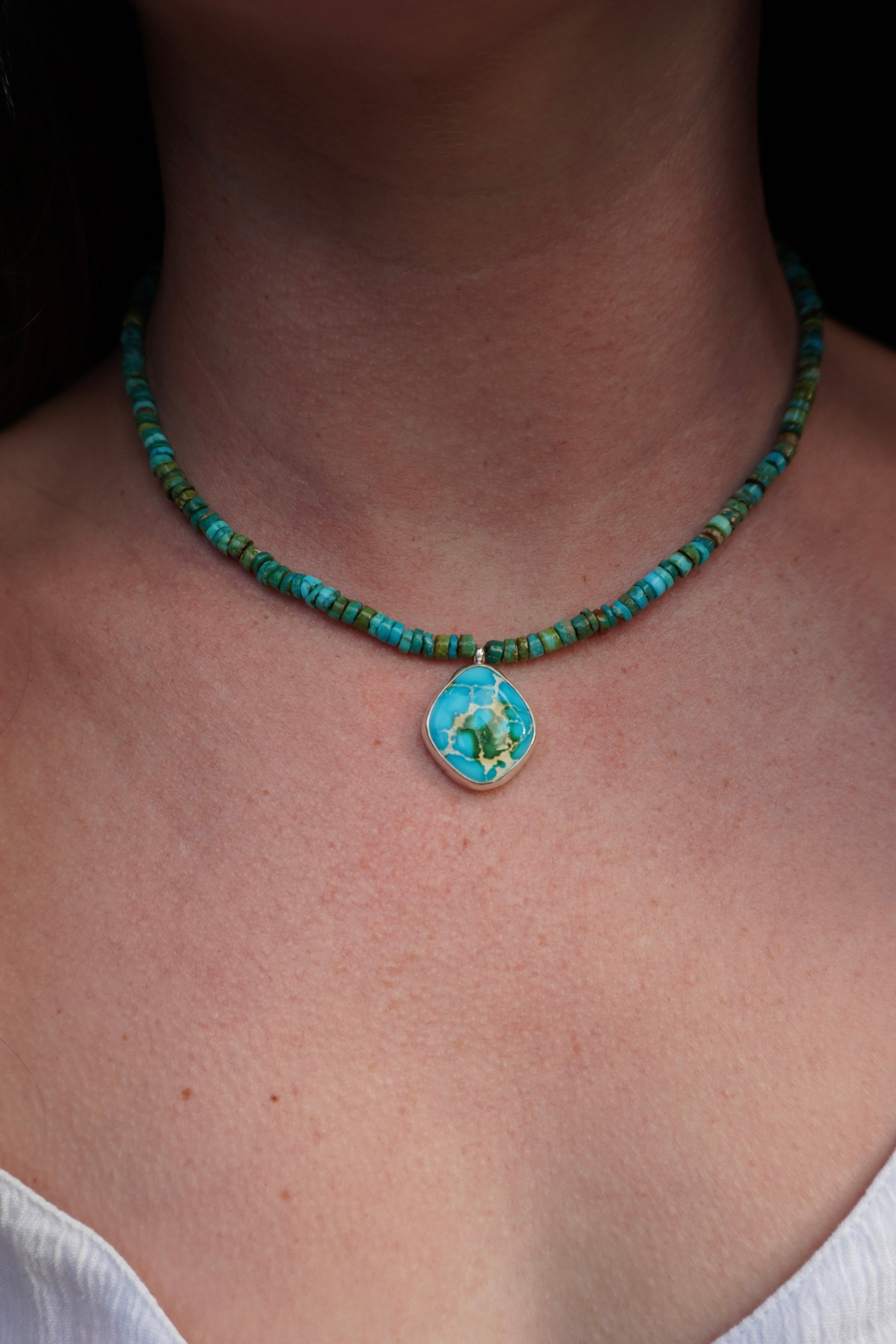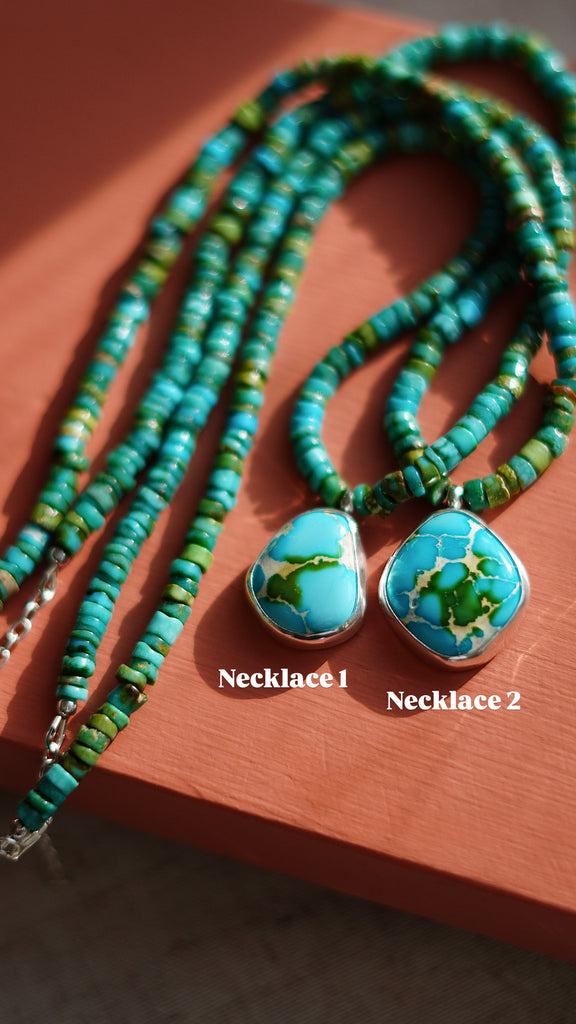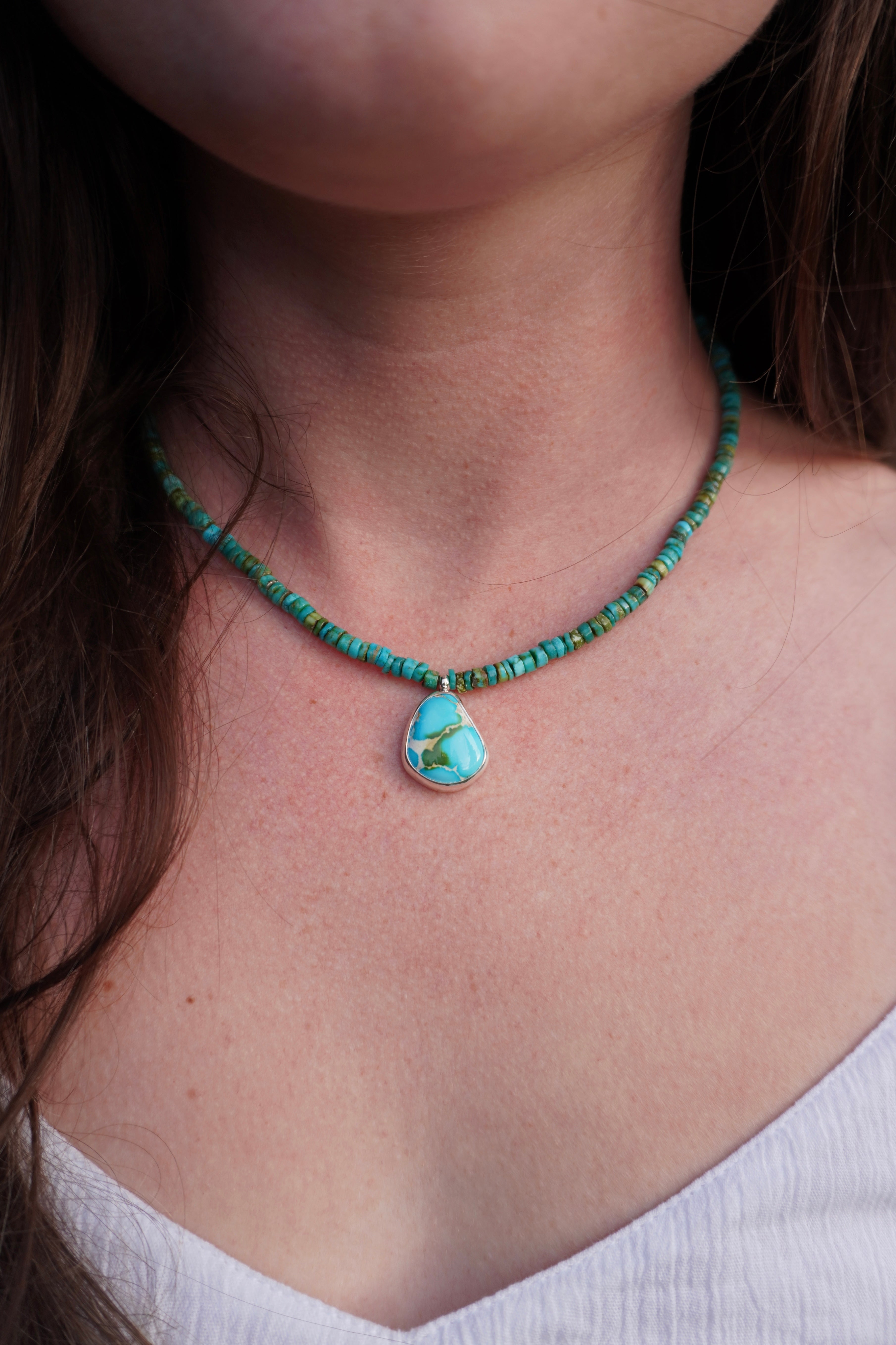 Stunning Sonoran Mountain Turquoise pendants with a simple silver settings hang from strings of Sonoran Mountain Turquoise 4.5 mm Heishi beads. They are adjustable between 16.5 and 18.5 inches.