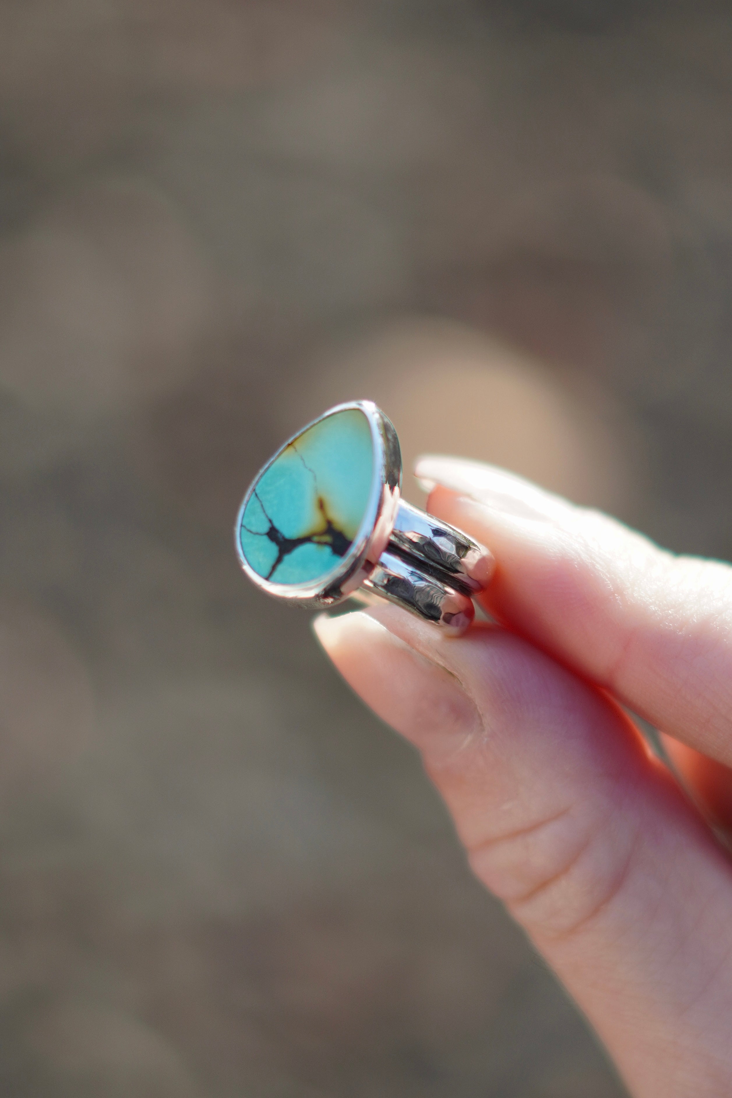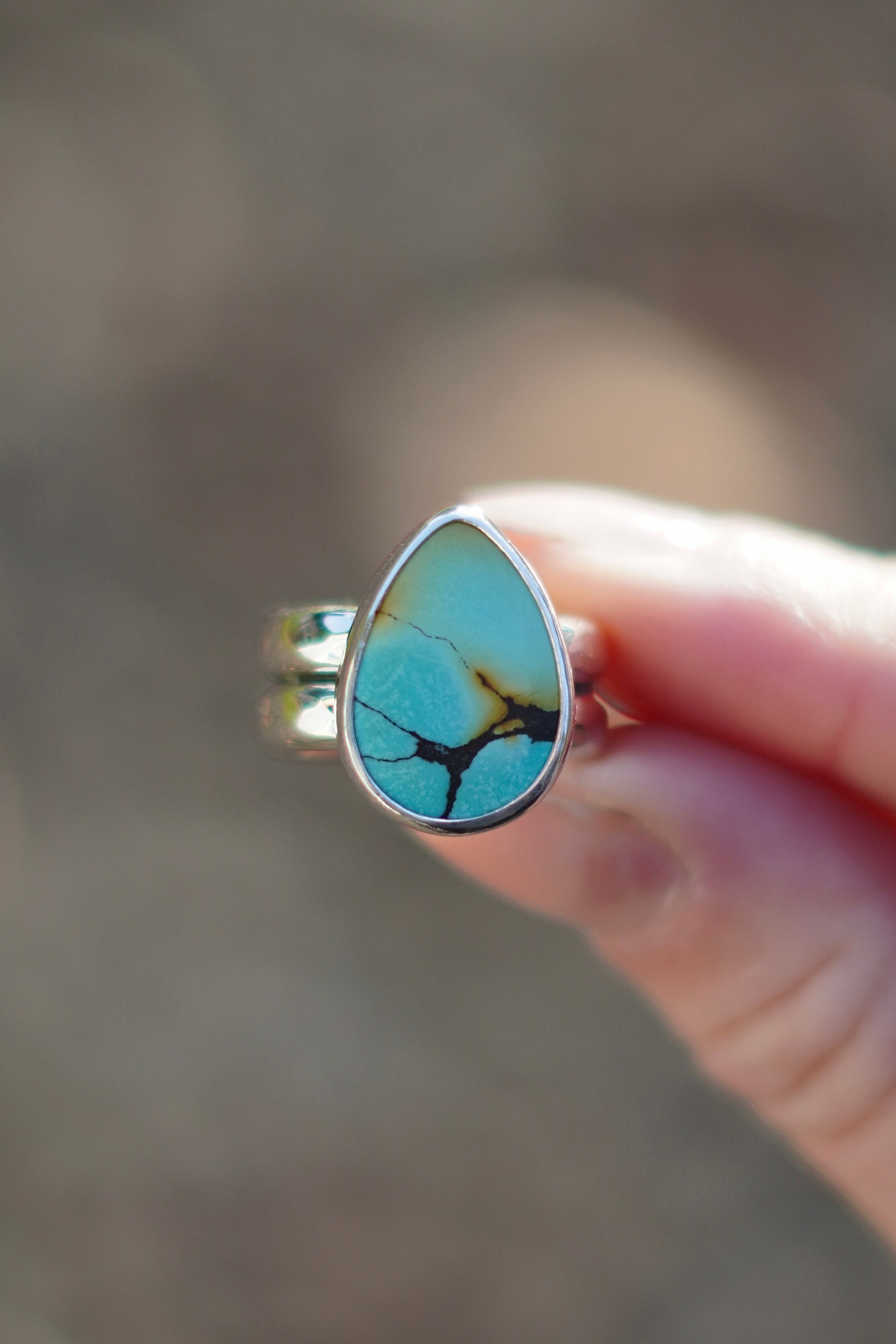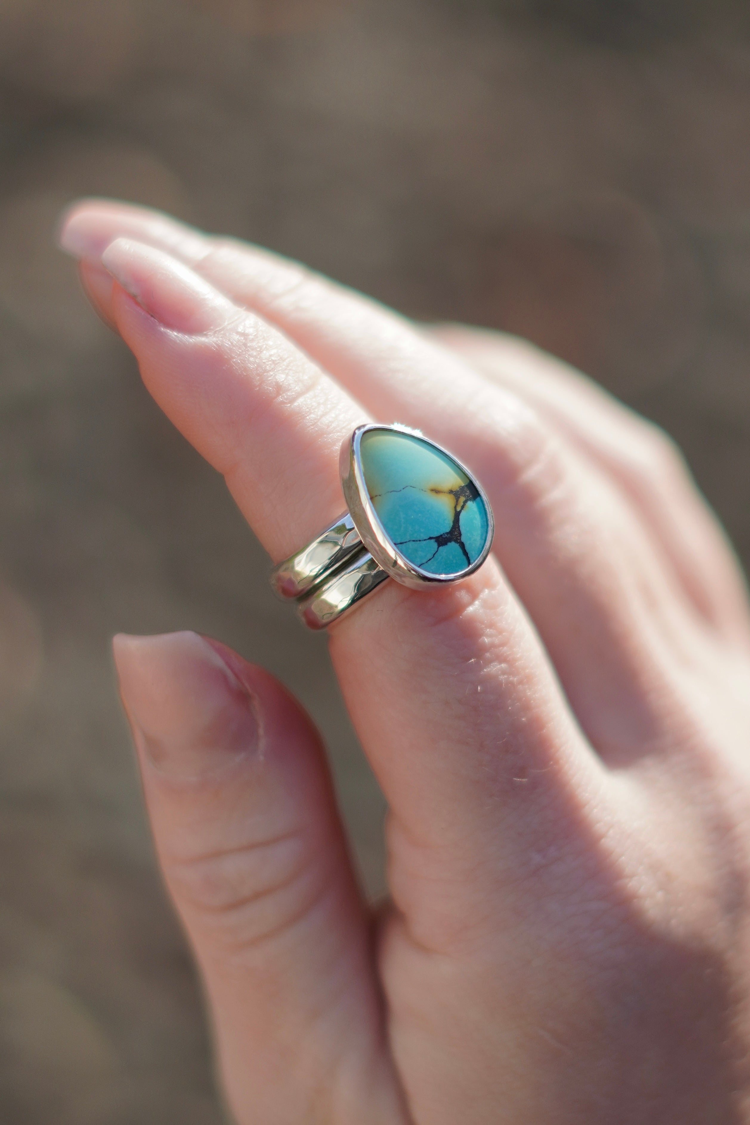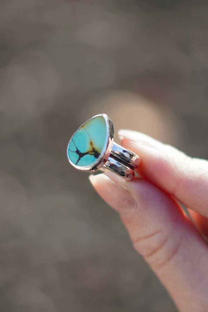 A stunning Huebi Turquoise stone with a simple silver setting on a hammered thick double band ring shank.