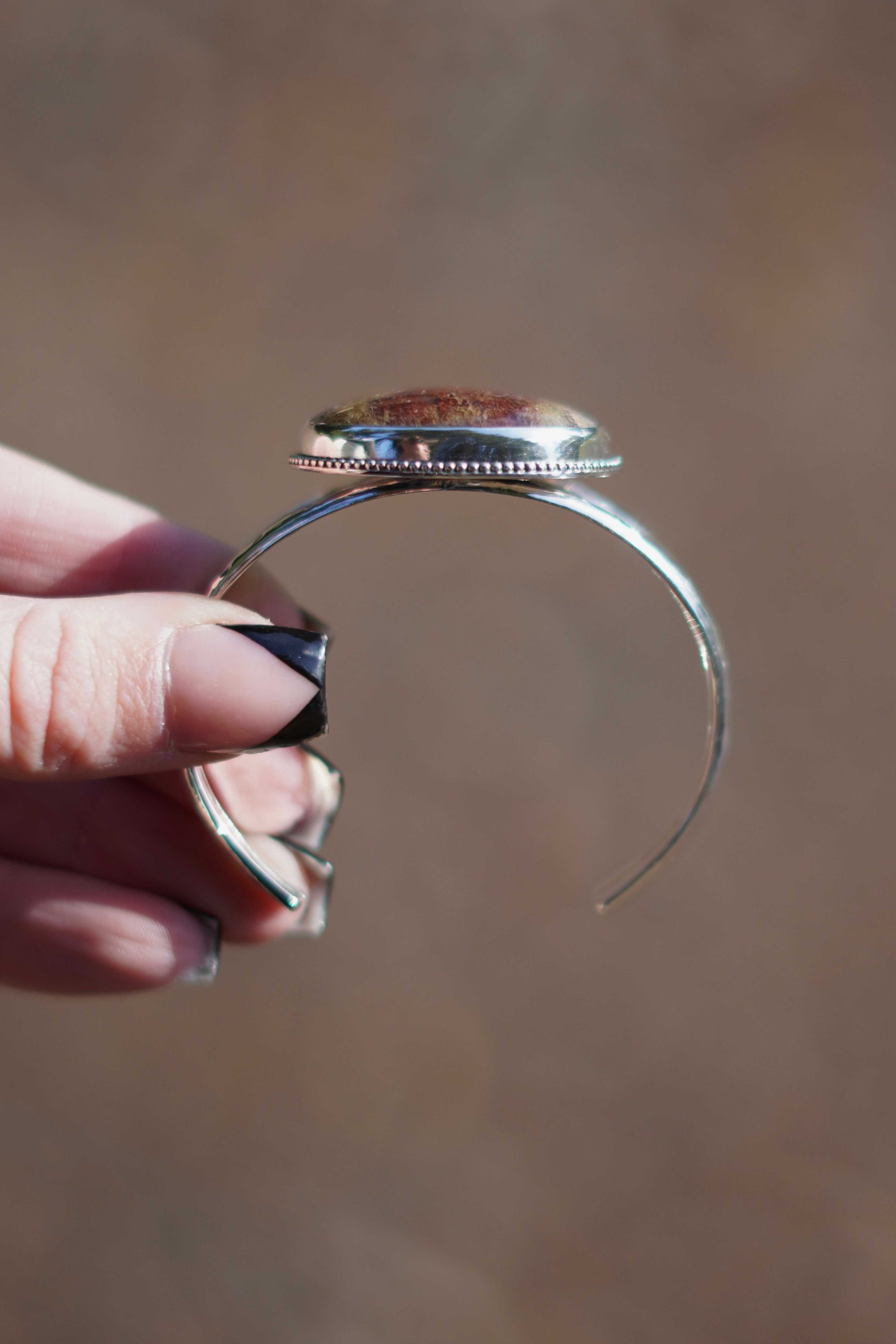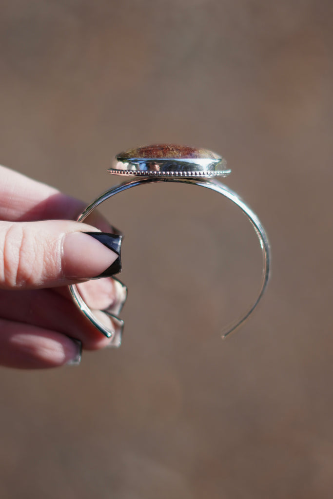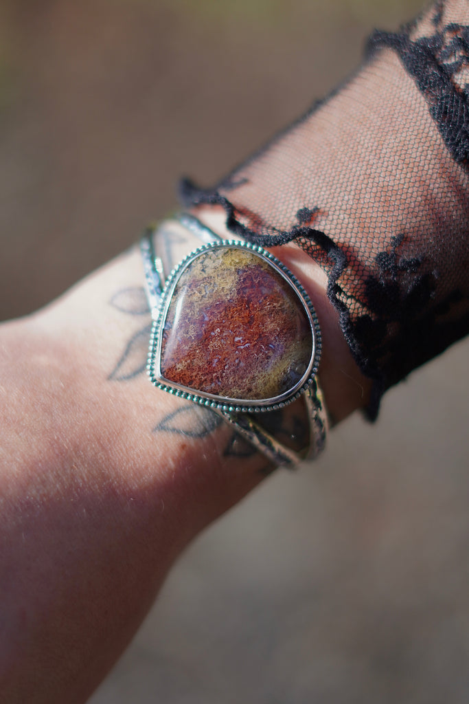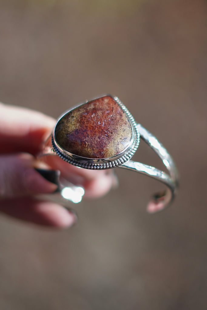 A unique Moss Agate with green and red tones paired with a hammered beaded border on a double band cuff shank with hammered texture.