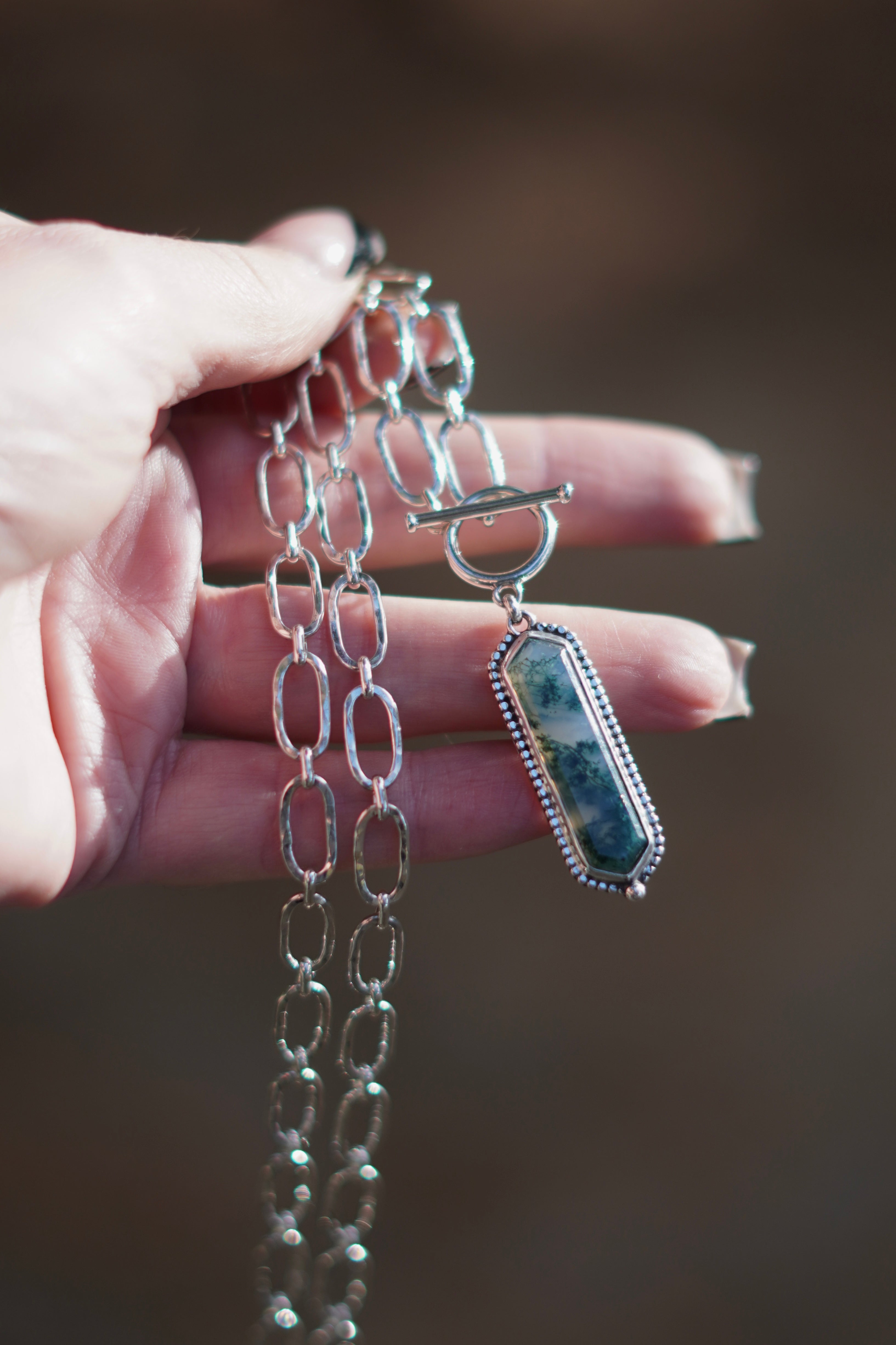 A gorgeous Moss Agate stone paired with a hammered beaded border and completely handmade chain with hammered texture detailing on the links.