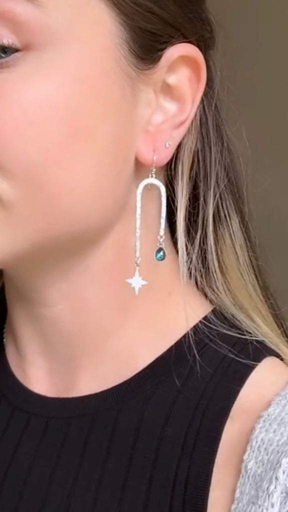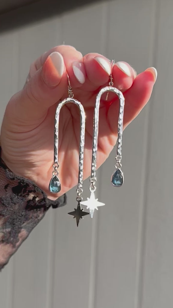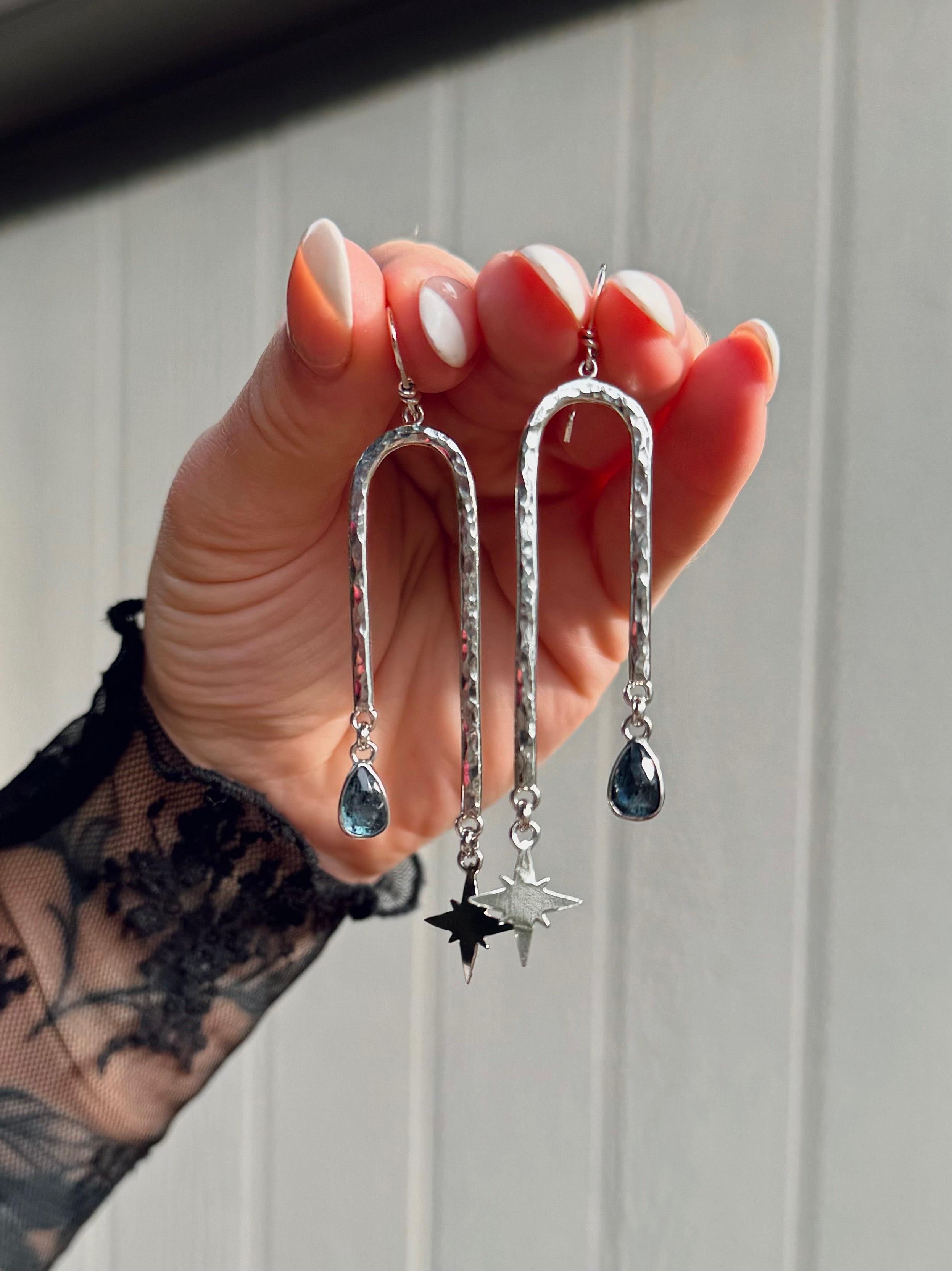 Night Arch earrings featuring faceted Kyanite stones, hand sawn stars and a little asymmetry. These earrings are super light weight and have a ton of sparkle and movement to them.