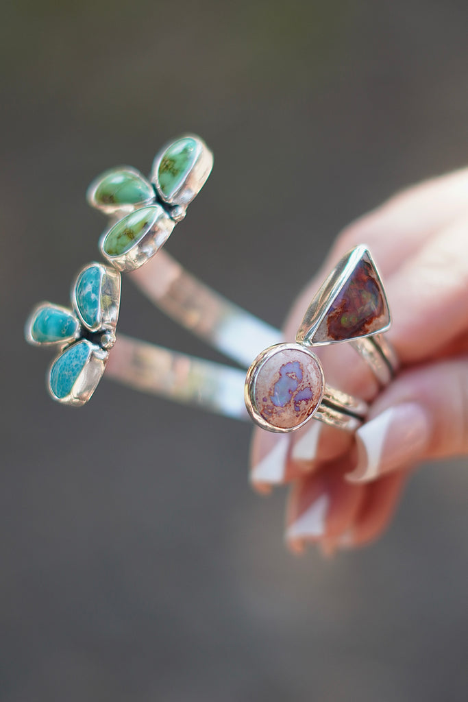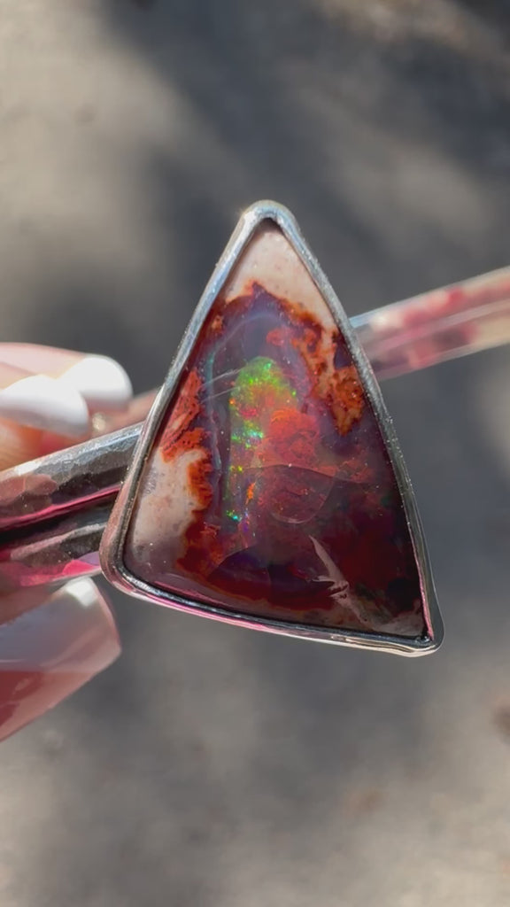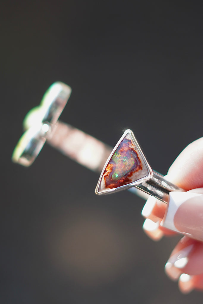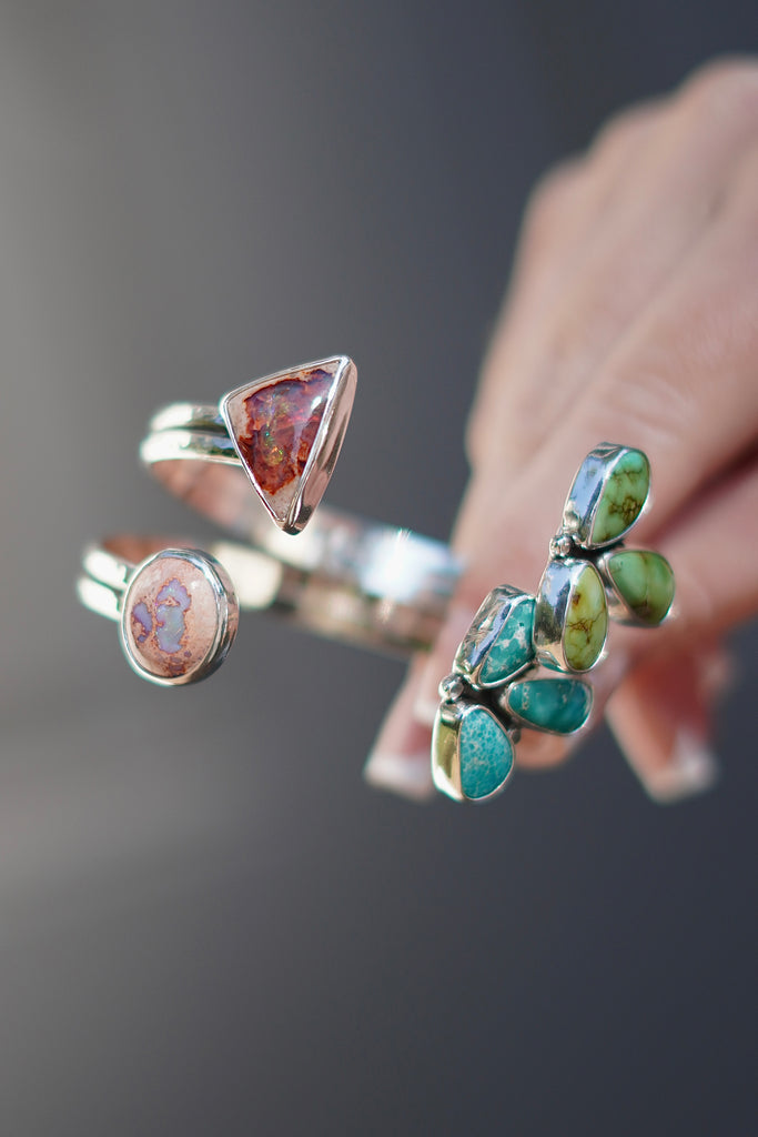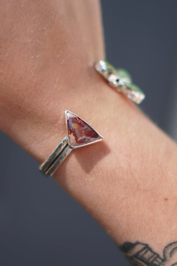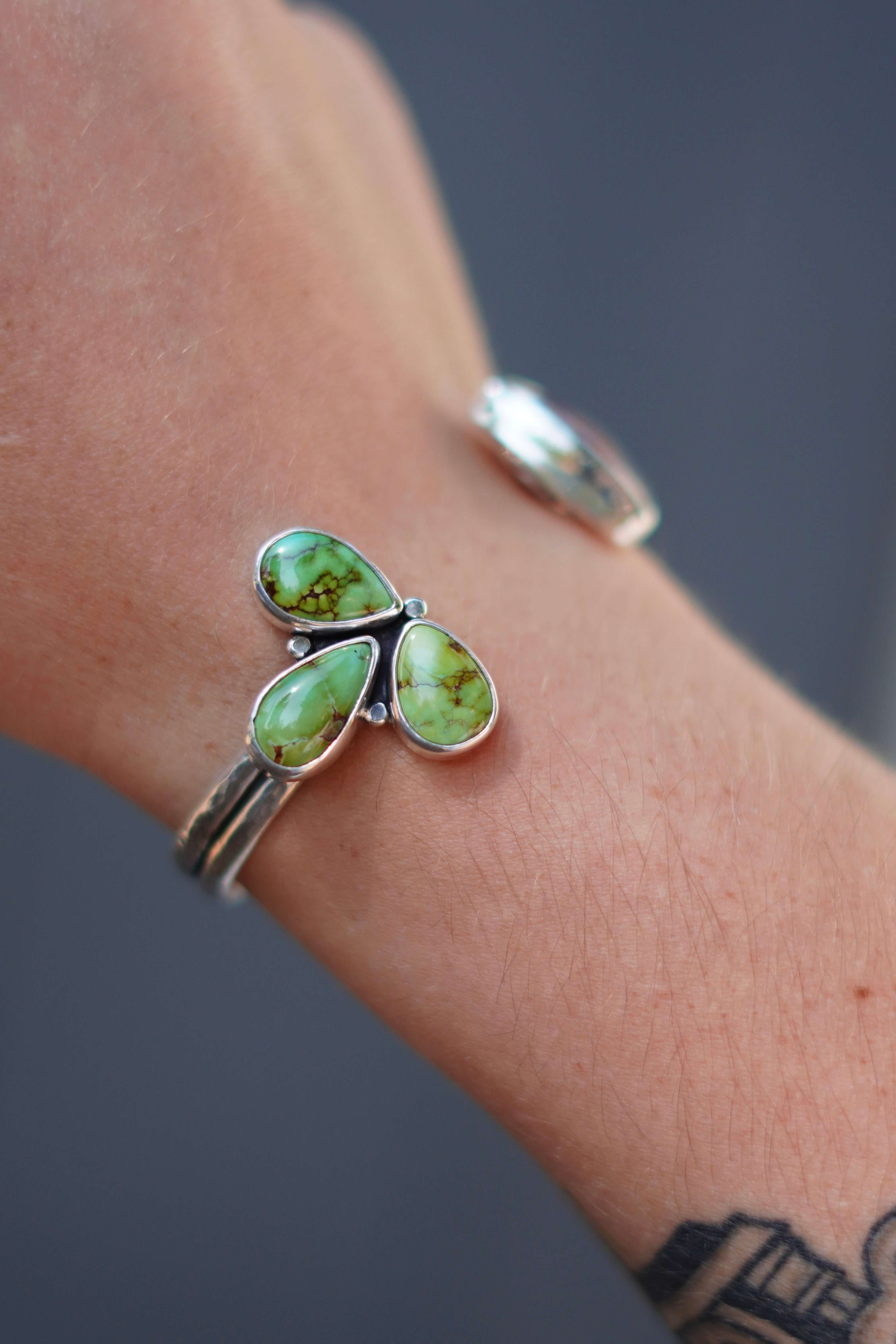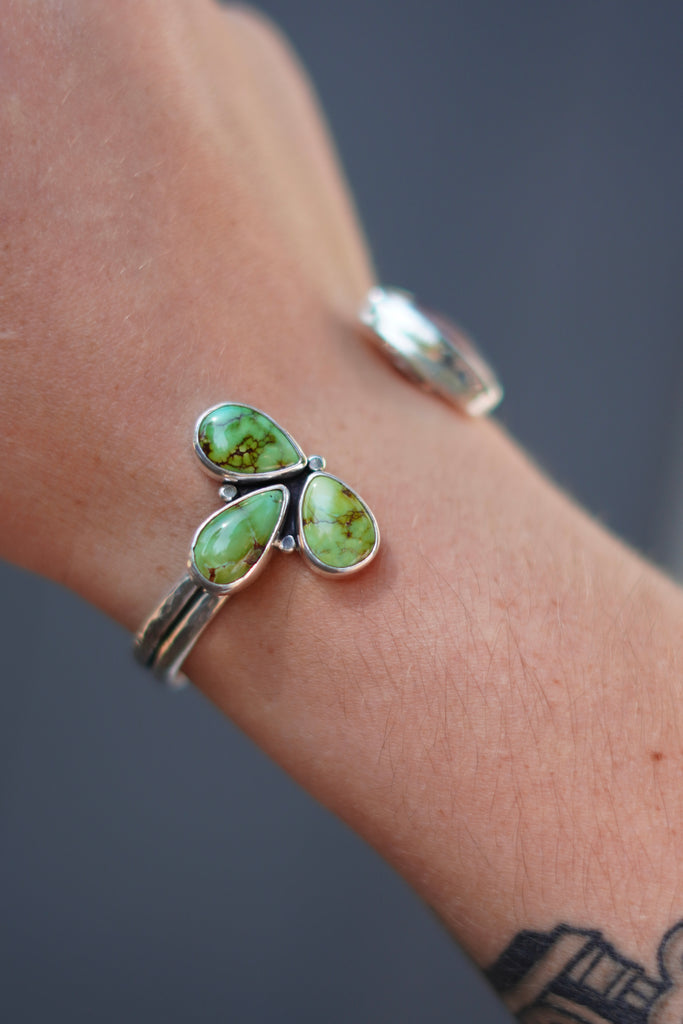 Jaw dropping lime green Sonoran Gold Turquoise stones paired with a gorgeous flashy Mexican Fire Opal on a open band cuff.