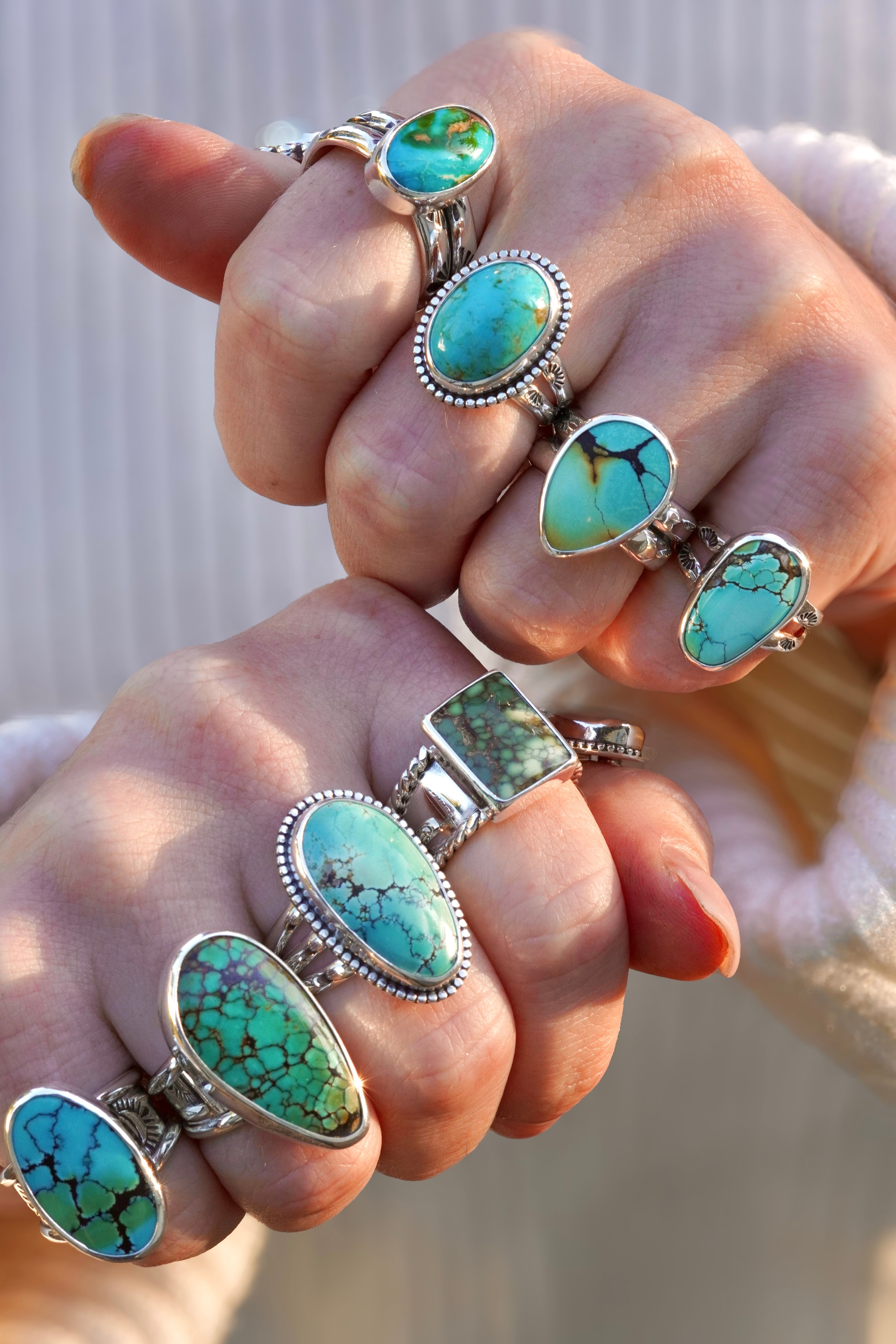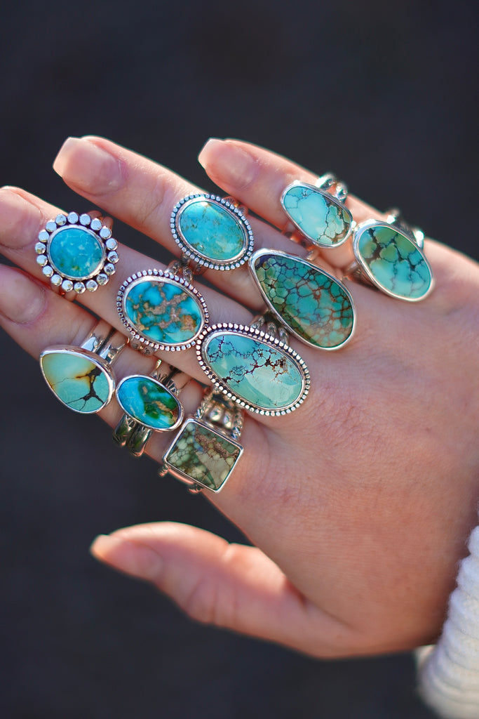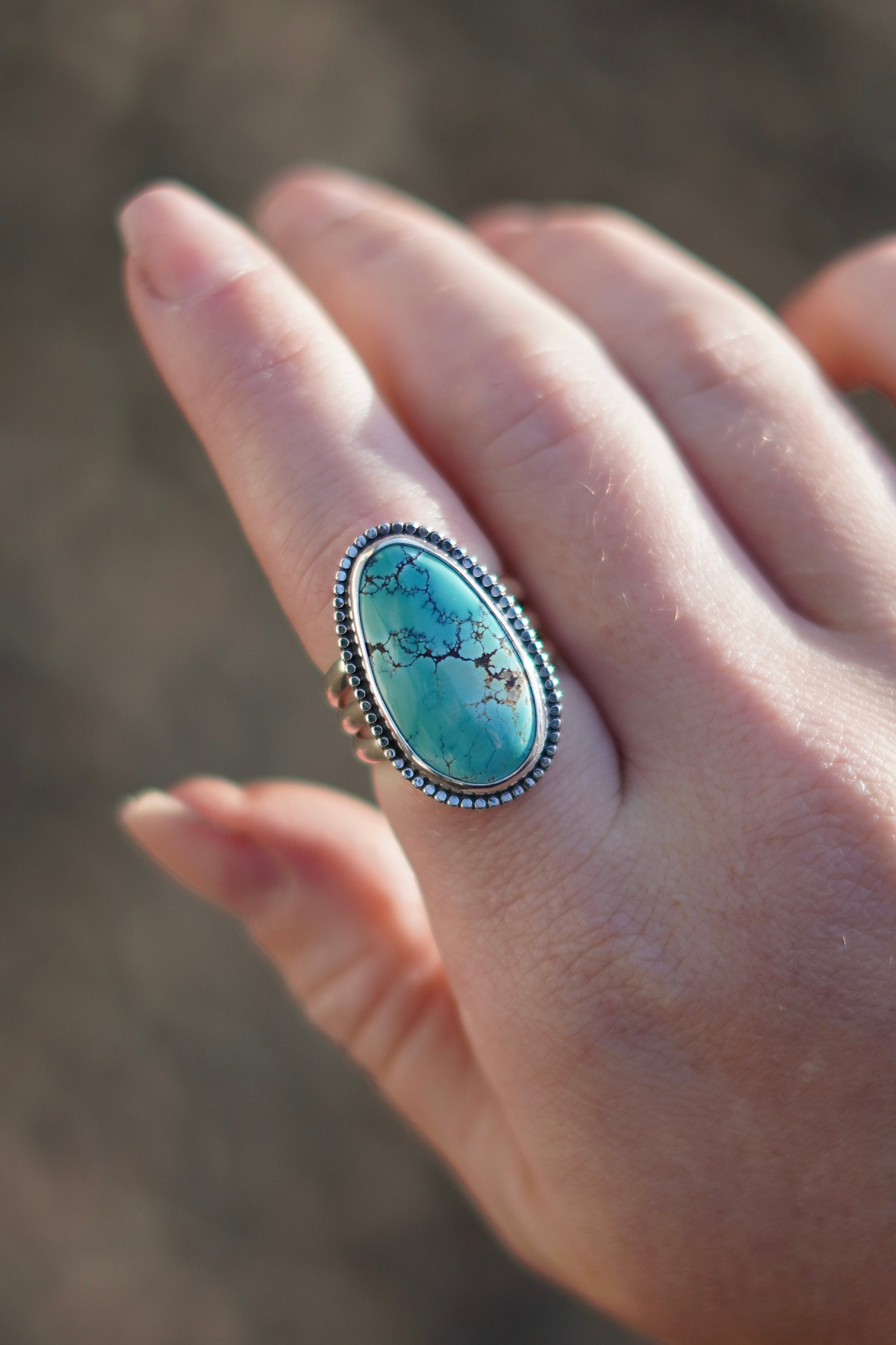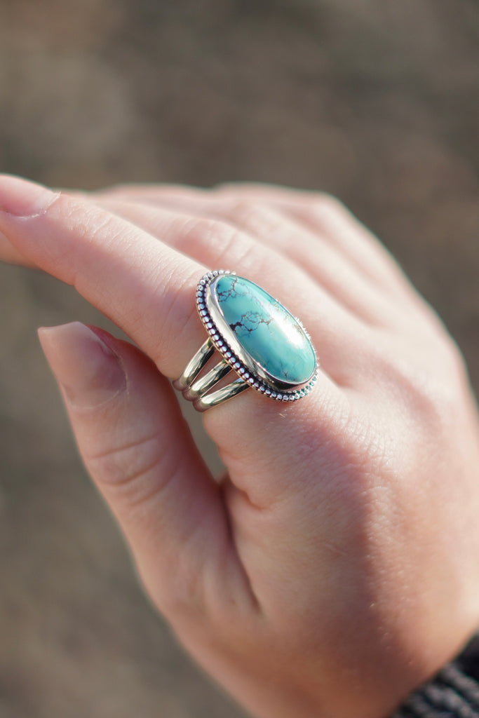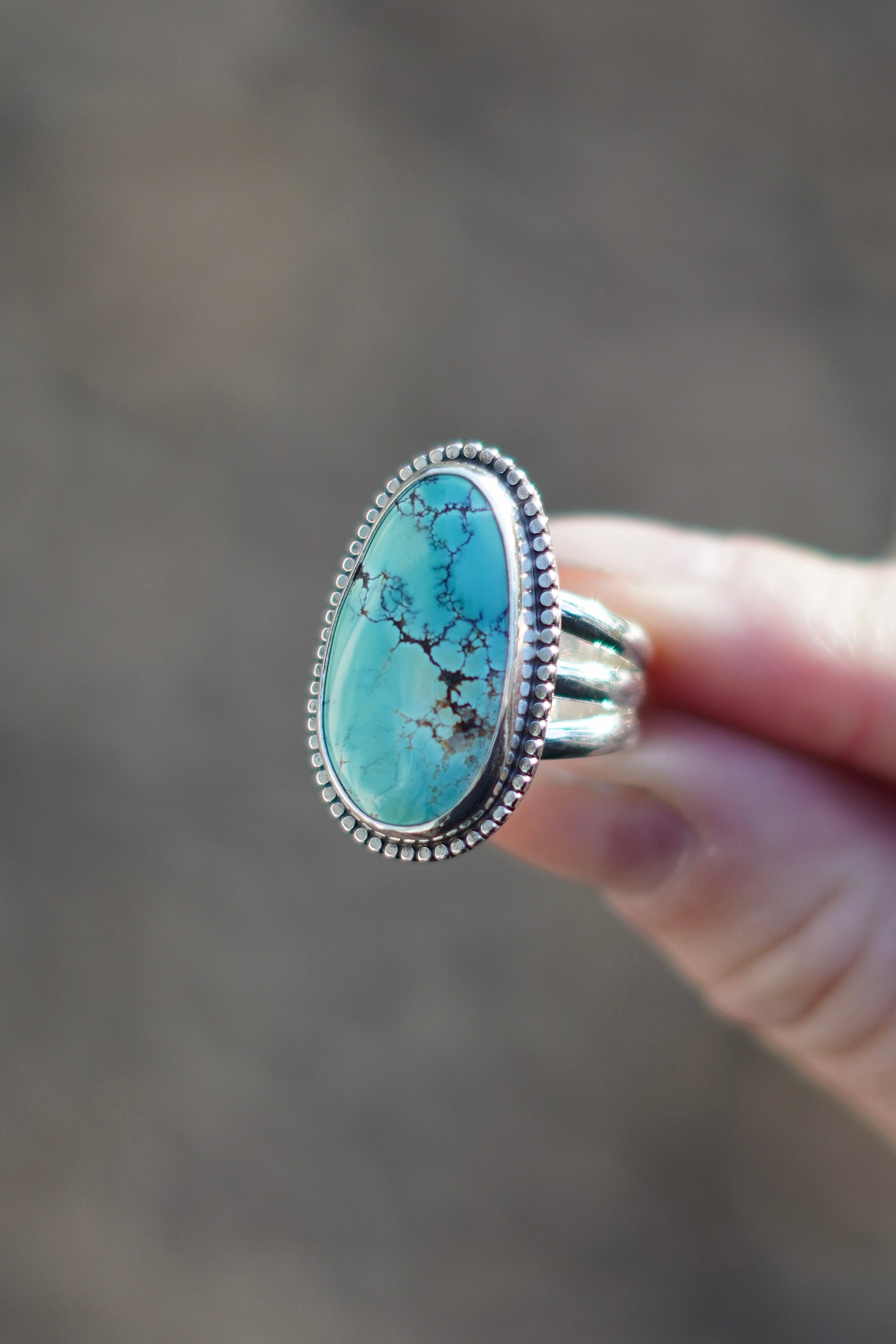 A stunning Huebi Turquoise stone paired with a hammered beaded border sitting on a triple band ring shank.