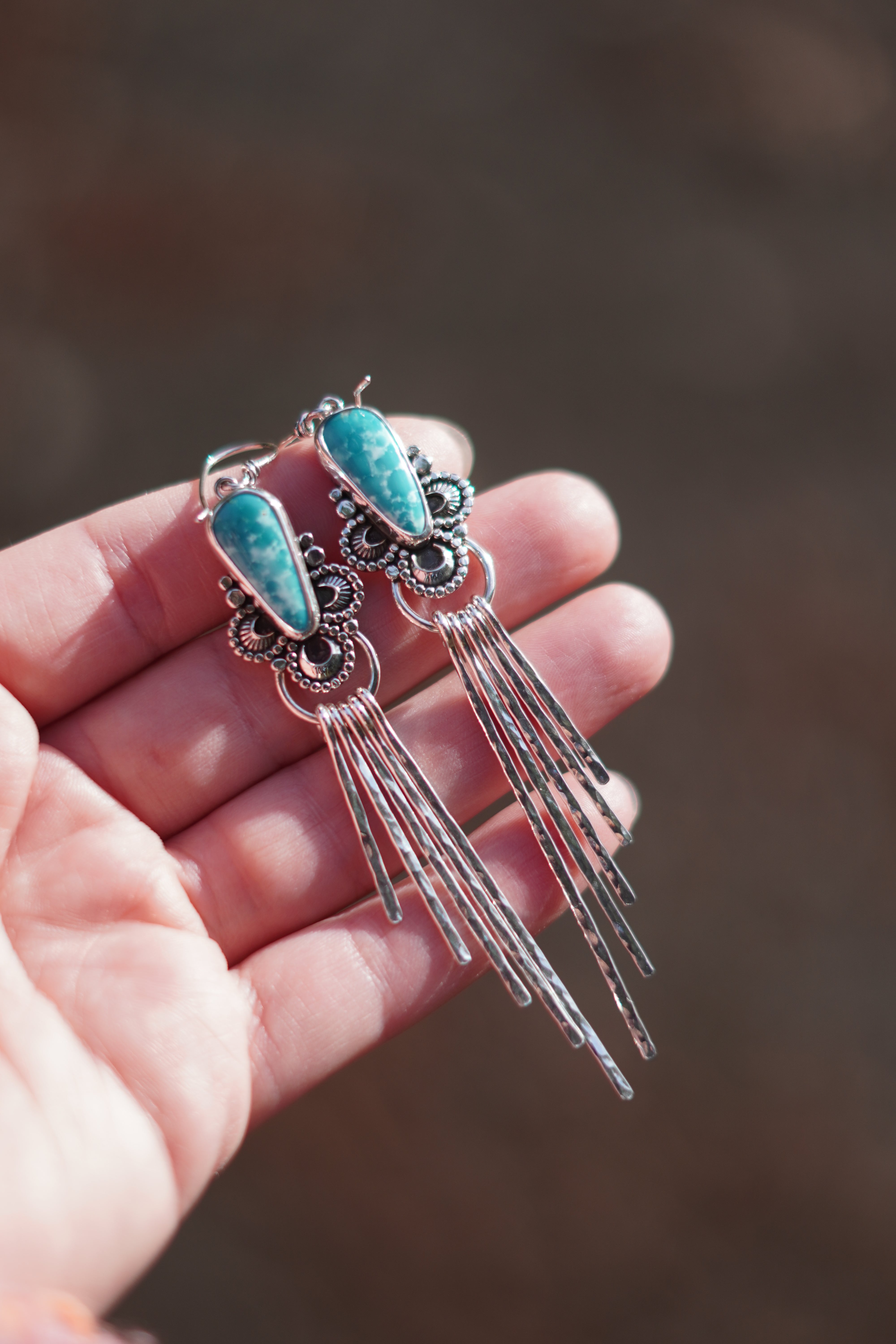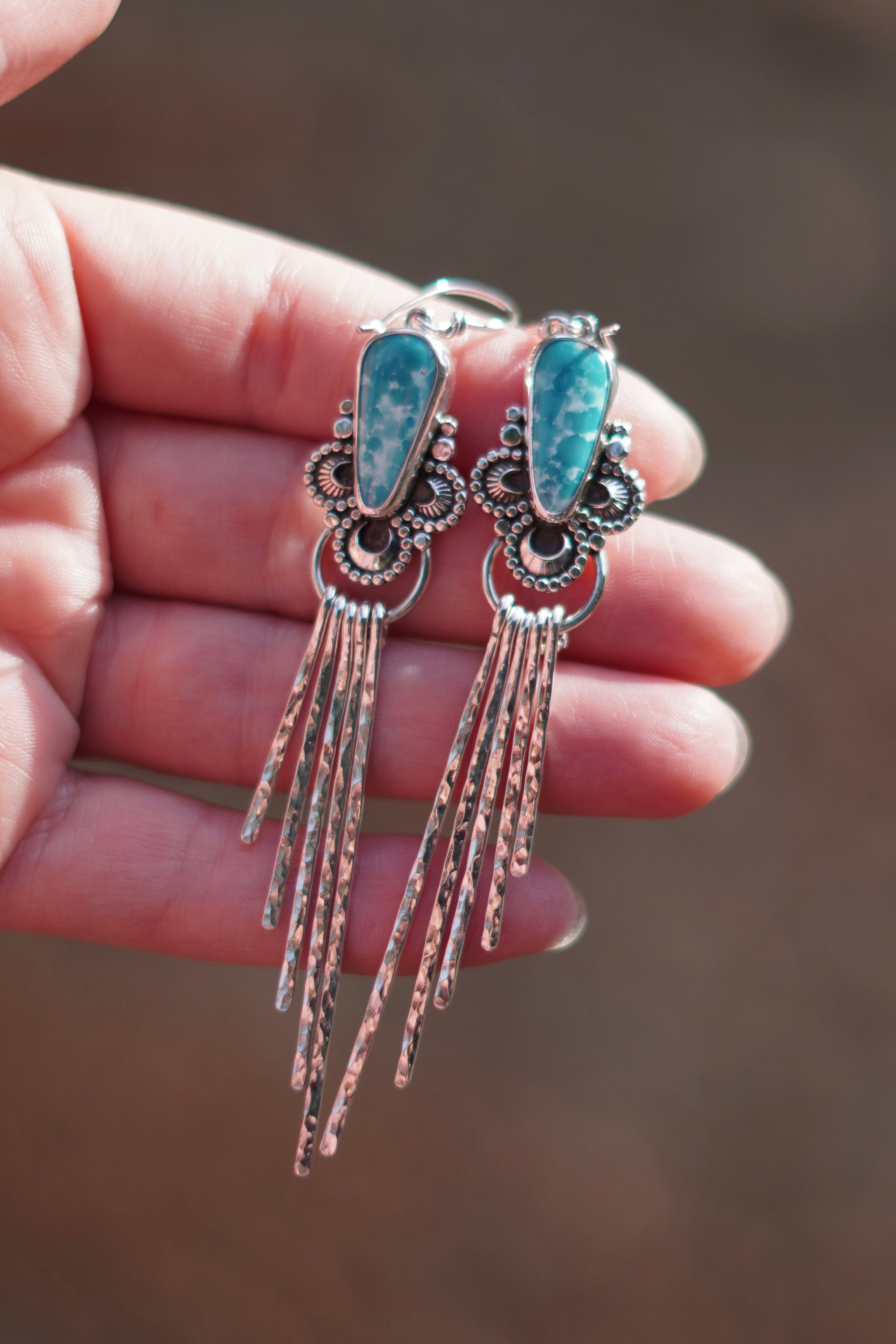 A stunning pair of White Water Turquoise stones paired with hand stamped elements, beaded borders and long hammered fringe. These earrings feature an earring hook.