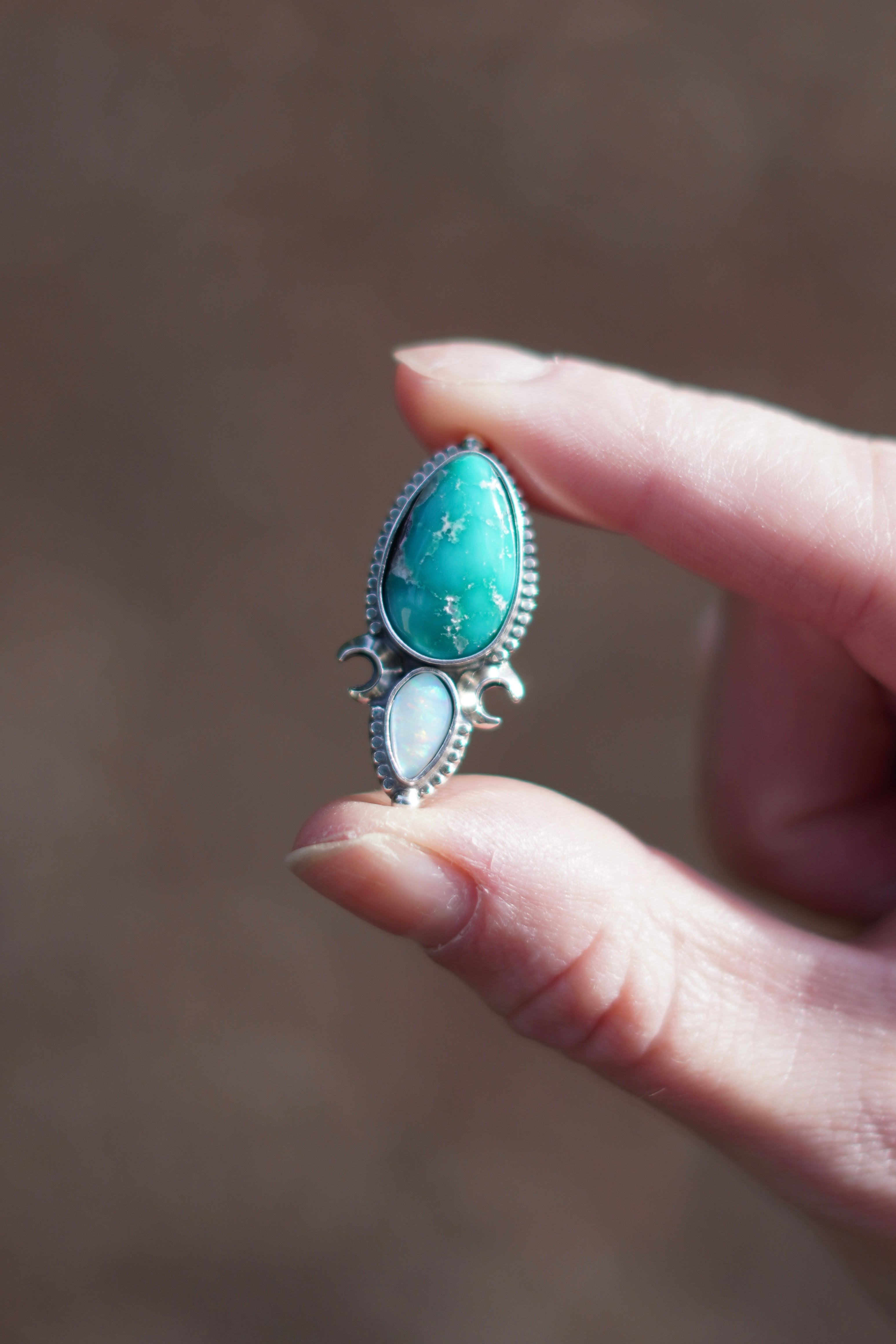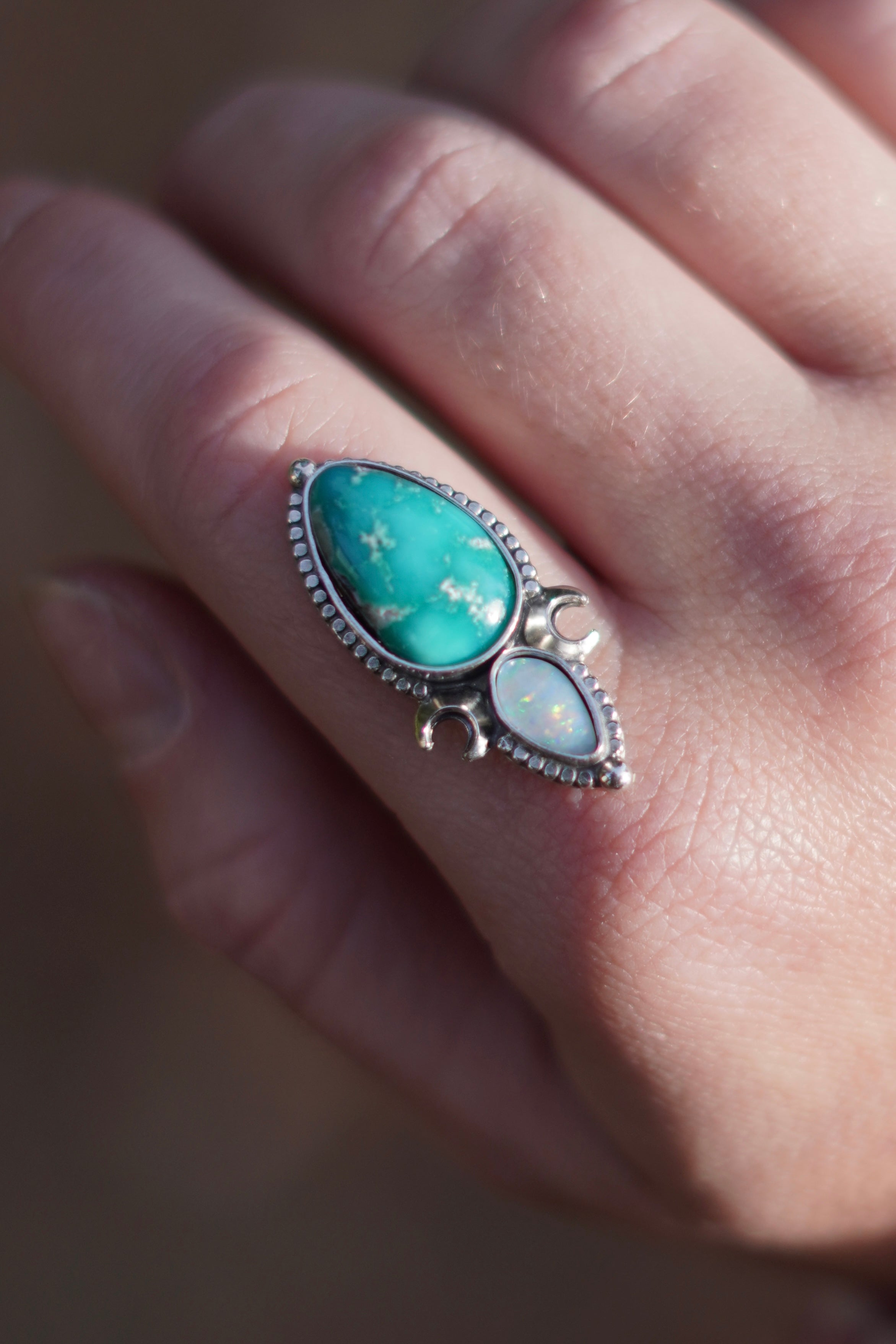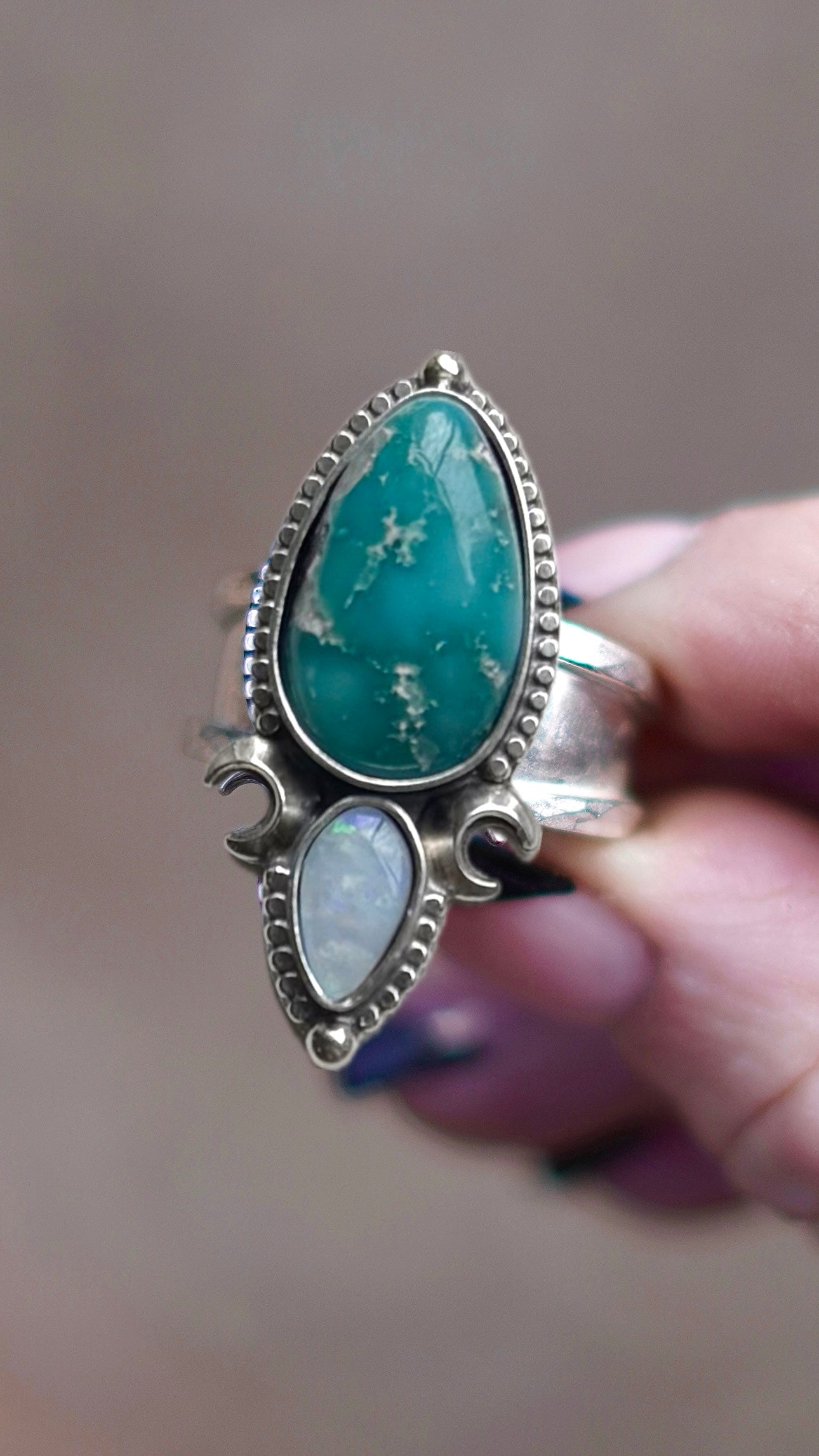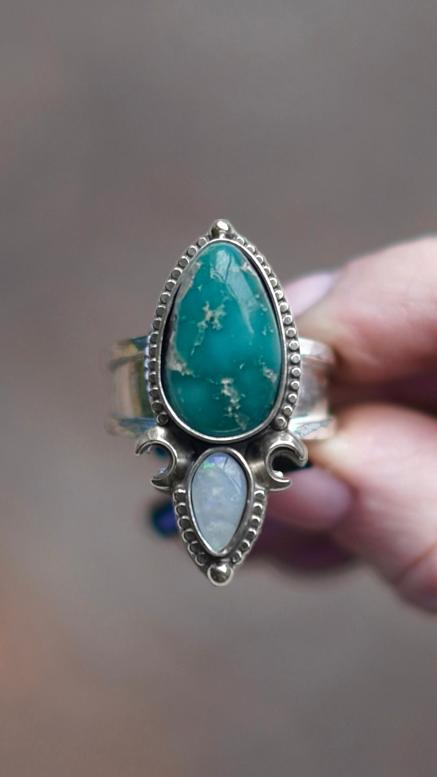A gorgeous White Water Turquoise stone paired with an Australian Opal and hammered beaded borders on a wide band ring shank.