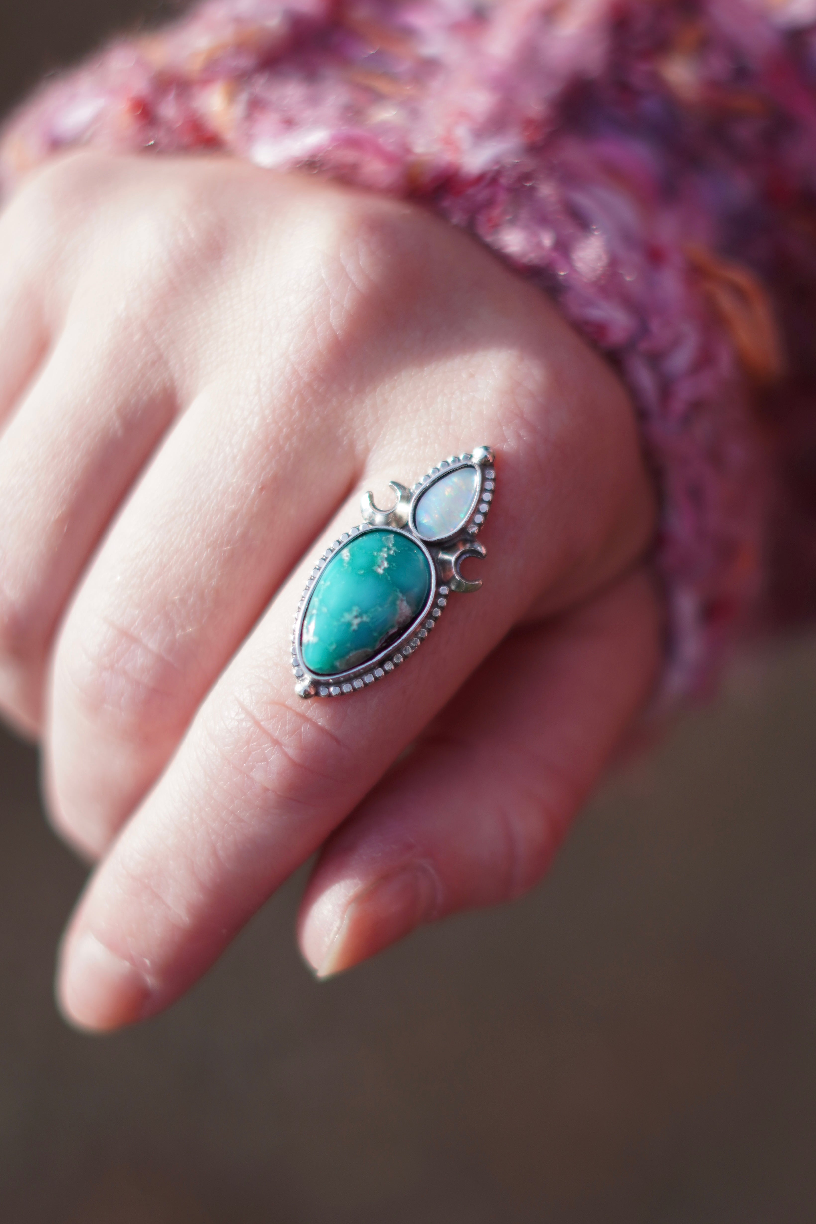 This ring is fully handcrafted and made with genuine stones, sterling and fine silver.